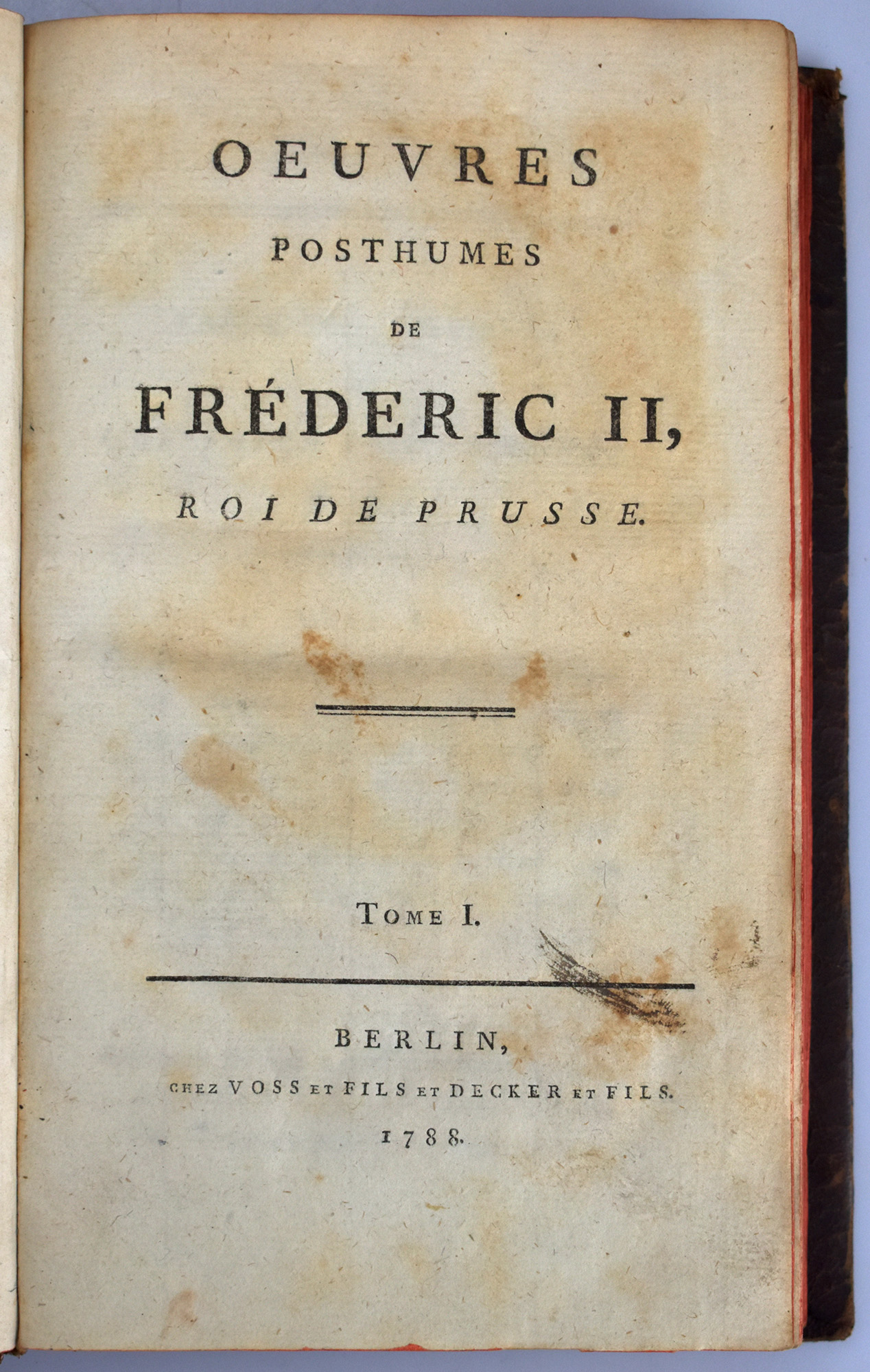 Friedrich II: Oeuvres posthumes de Fréderic II, Roi de Prusse. 15 Bände (komplett). Berlin, Verlag Voss und Decker, 1788. 8°. 21,5 x 13,5 cm. [3] Blatt, 288 Seiten; [3] Blatt, 331 Seiten; [1] Blatt, 358 Seiten; [2] Blatt, 421 Seiten; [2] Blatt, 354 Seiten; [2] Blatt, 329 Seiten; [4] Blatt, 365 Seiten; [3] Blatt, 376 Seiten; 382 Seiten; 348 Seiten; 335 Seiten; 316 Seiten; 352 Seiten; 286 Seiten; 284 Seiten. Ganzlederbände der Zeit auf 5 Bünden, mit reicher ornamentaler Rückenvergoldung, goldgeprägten Titeln auf Lederrückenschildchen, marmorierten Vorsätzen und Rundum-Rotschnitt.