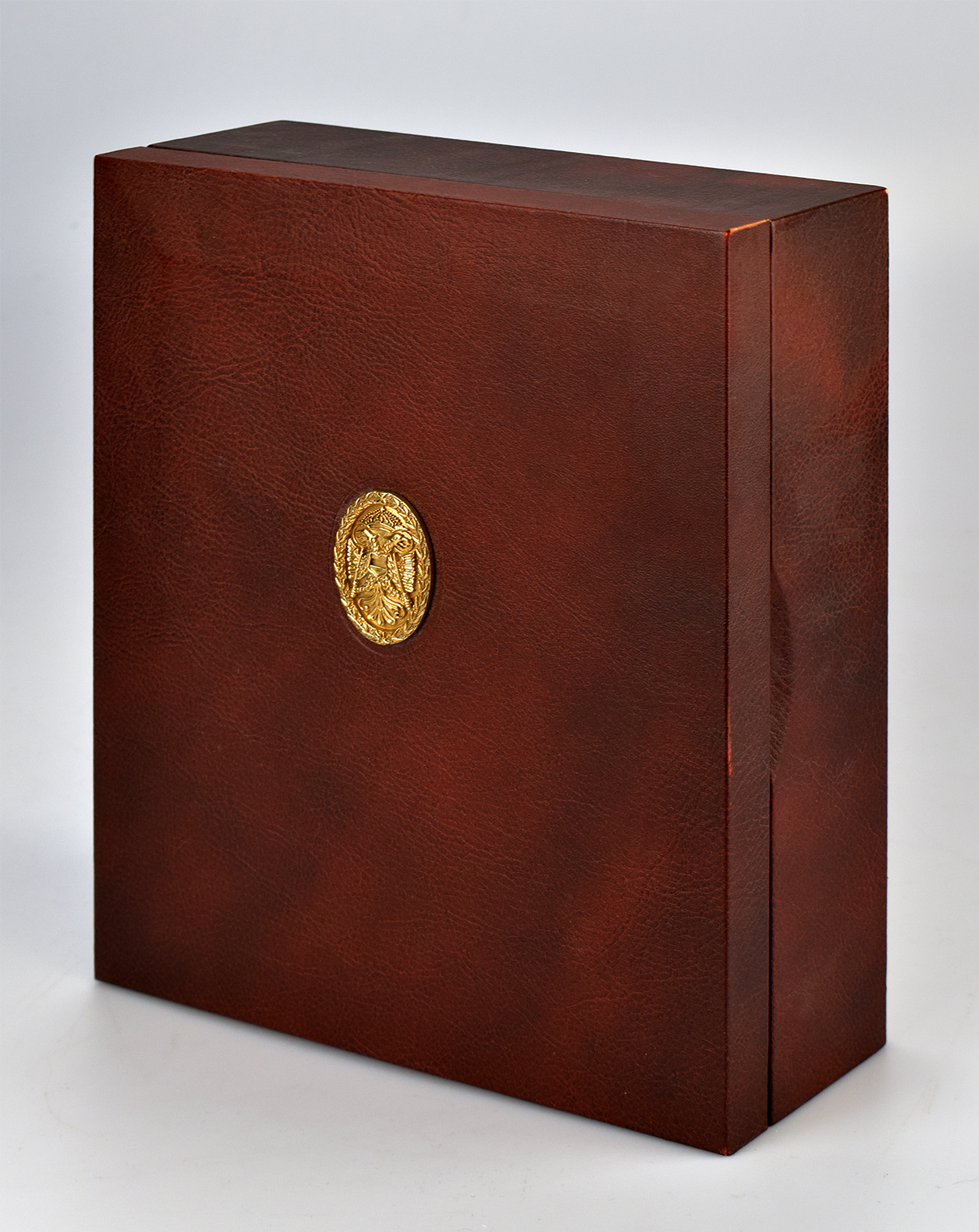 Facsimile volume in original full leather, 5 raised bands, with red leather spine labels, ornamental gilt tooling on the spine, gilt supralibros, and red edges. Commentary volume in original full cloth with gilt titles. Both housed in a leather slipcase with a mounted, gilt medallion on the cover. Number 46 of 99 copies of the luxury edition from the sub-edition Bibliotheca Rara.