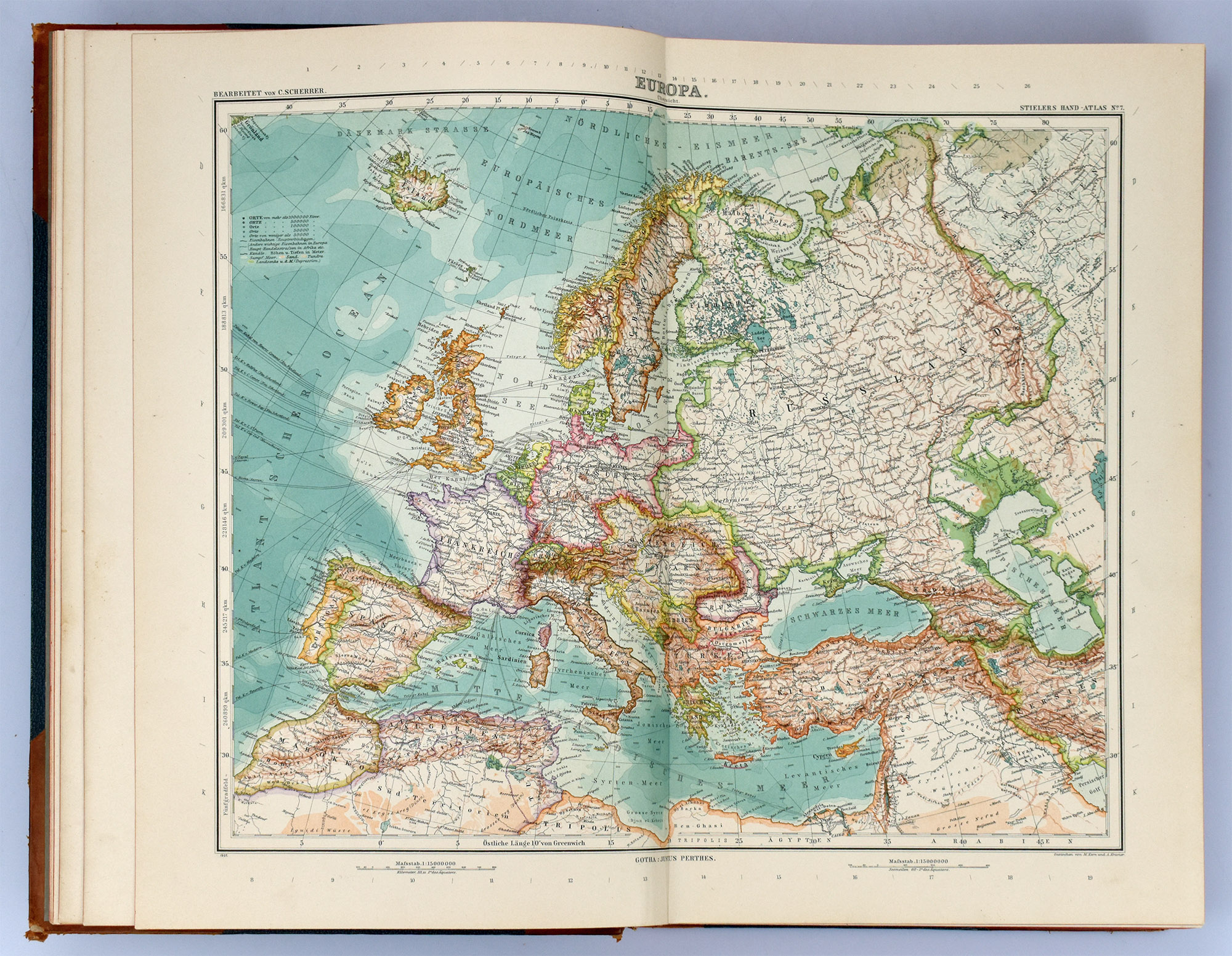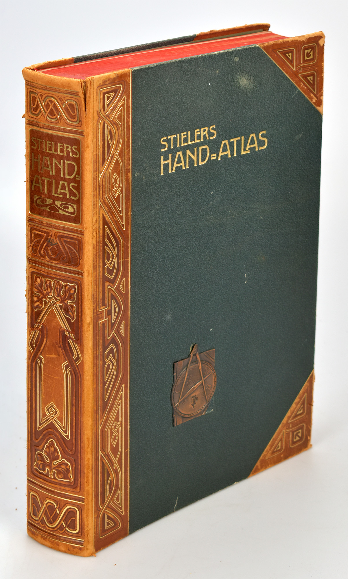 Stieler, Adolf: Stielers Hand-Atlas. 100 Karten in Kupferstich. Mit 162 Nebenkarten. Herausgegeben von Justus Perthes’ Geographischer Anstalt in Gotha. Gotha, Verlag Justus Perthes, 1907. 2°. 41 x 26,5 cm. [410], 238 Seiten. Original-Halblederband mit Blind- und Goldprägung nach Art des Jugendstils, illustrierten Vorsätzen, Verlagssignet als Metallrelief auf den Vorderdeckel montiert und Rundum-Rotschnitt.