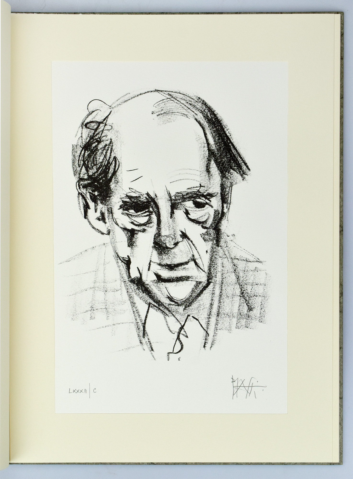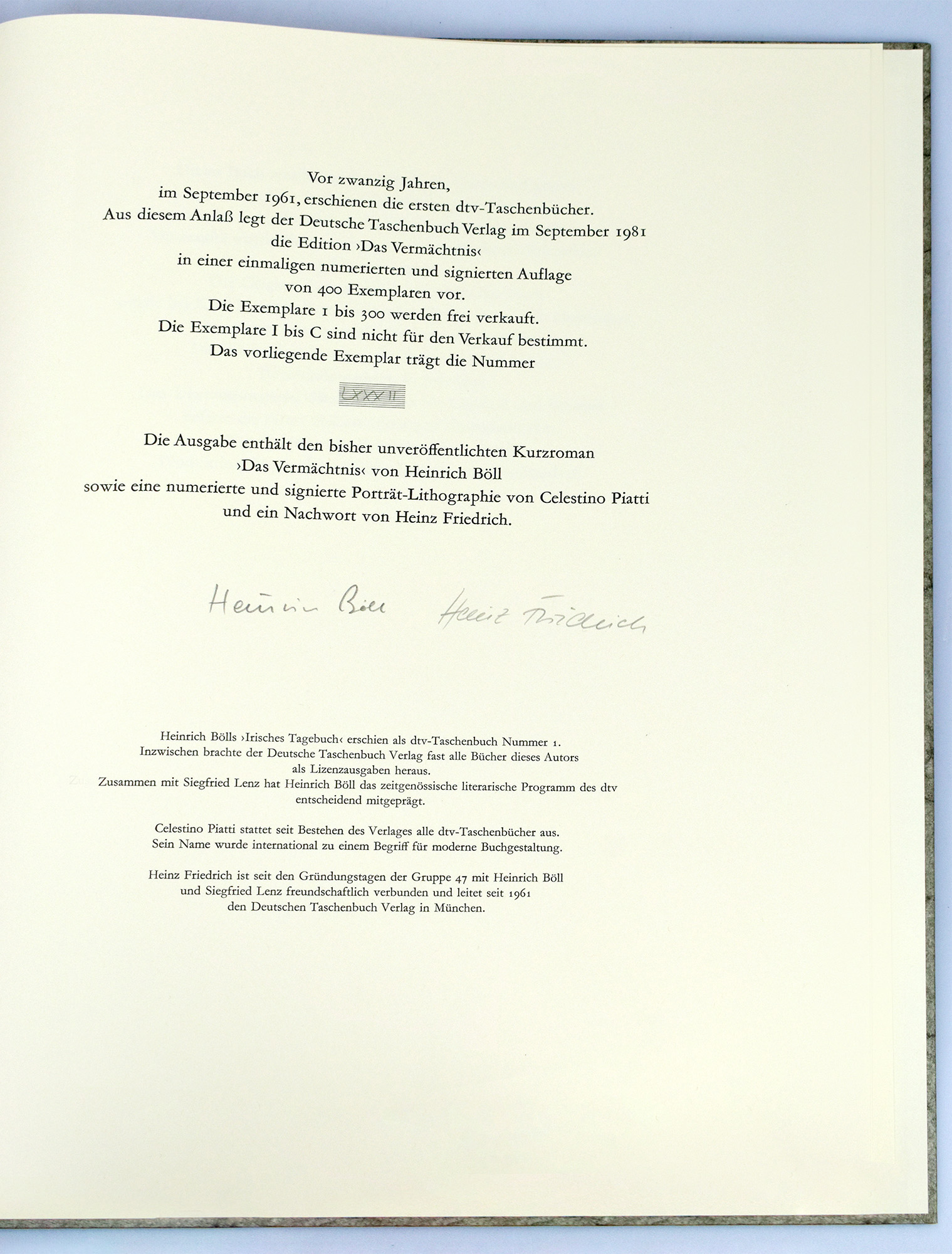 Original paper-covered boards in the original slipcase. Number XXIV of 100 (a total of 400) Roman-numeraled copies, not intended for sale, and signed in pencil in the colophon by Heinrich Böll and Heinz Friedrich. With an original lithograph by Celestino Piatti, likewise numbered and signed, loosely inserted into a mounted passepartout bound into the book. Sheet size: 41.0 × 30.0 cm. Image size: 26.0 × 21.0 cm. This book was set in Monotype Garamond and printed in letterpress. Werkdruckpapier from the Scheufelen paper mill was used. The original lithograph by Celestino Piatti was pulled from the stone by Kurt Meier in Basel on Arches wove paper. After printing, the stone was ground down. The binding work was carried out by the firm Richard Mayer, master bookbinder, in Stuttgart. The covering material “elephant hide” for the binding and slipcase was supplied by the firm Hubert Herzog in Dornstadt/Ulm. A fine copy.