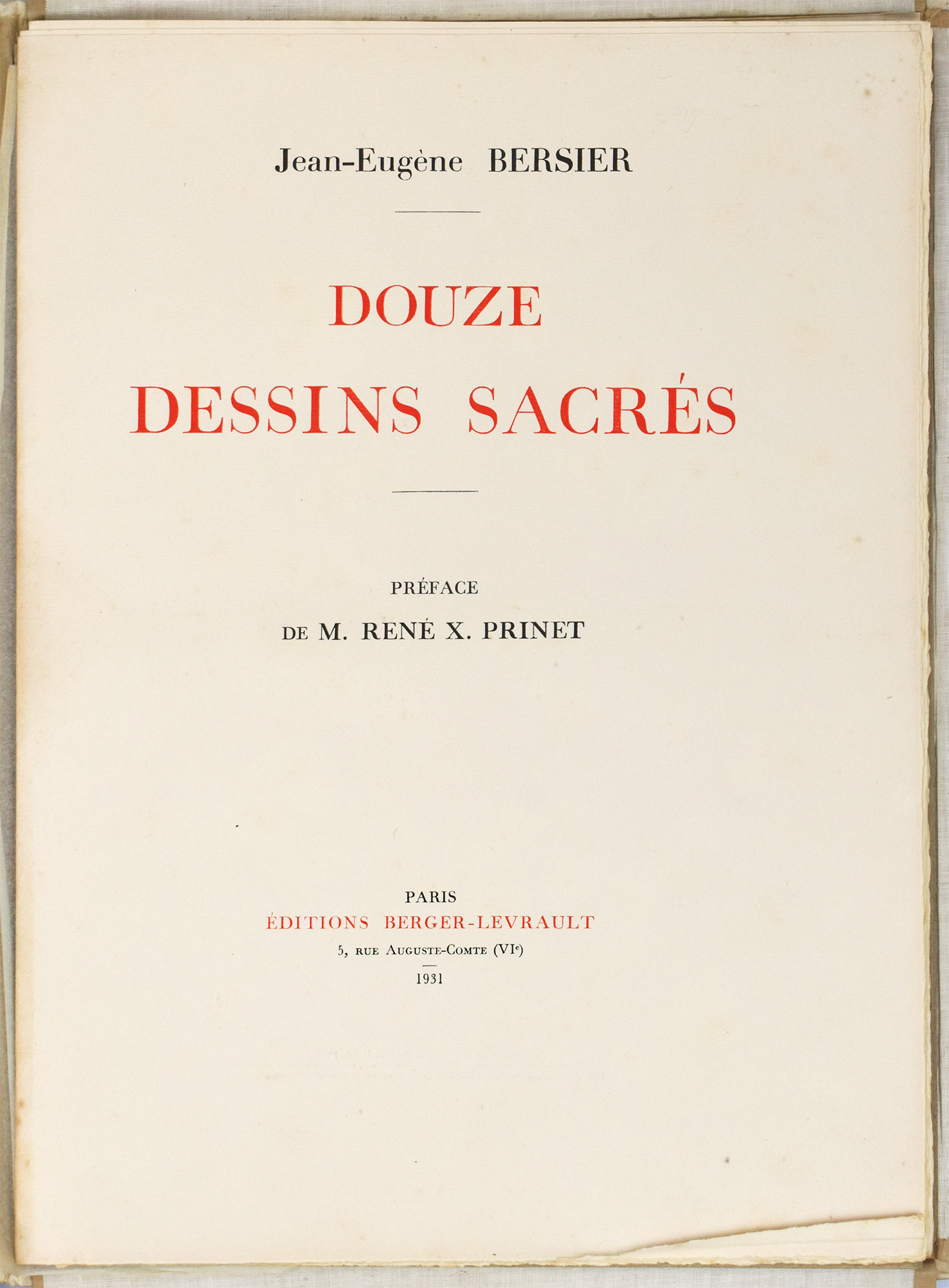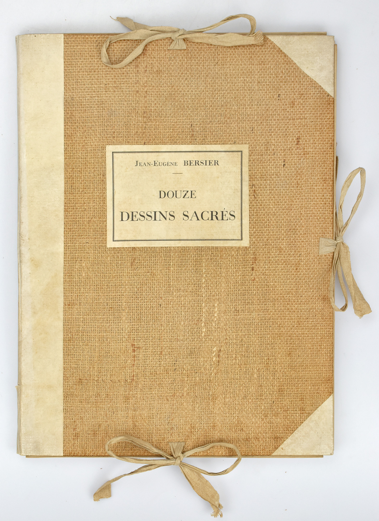Bersier, Jean-Eugene: Douze dessins sacrés. Préface de René X. Prinet. [Signiertes Widmungsexemplar]. Paris, Editions Berger-Levrault, 1931. 2°. 41 x 31 cm. [1] Blatt, 9, [1] Seiten, [2] Blatt auf einfach gefalzten Bögen und 12 Tafeln lose in Original-Halbpergamentmappe mit Innenbezug aus Marmorpapier und mit Schleifenverschlüssen.