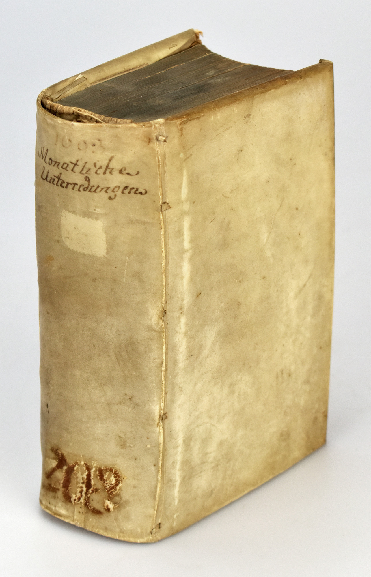 [Tentzel, Wilhelm Ernst]: Monatliche Unterredungen einiger guten Freunde von allerhand Büchern und andern annehmlichen Geschichten. Januarius [bis] December 1697. 12 Teile und dreiteiliger Registeranhang [in 1 Band, kompletter Jahrgang]. Leipzig, Verlag Thomas Fritsch, 1697. Klein-8°. 15 x 11 cm. [1] Blatt, 1012 Seiten, [28] Blatt. Pergamentband der Zeit mit Rundum-Blauschnitt.