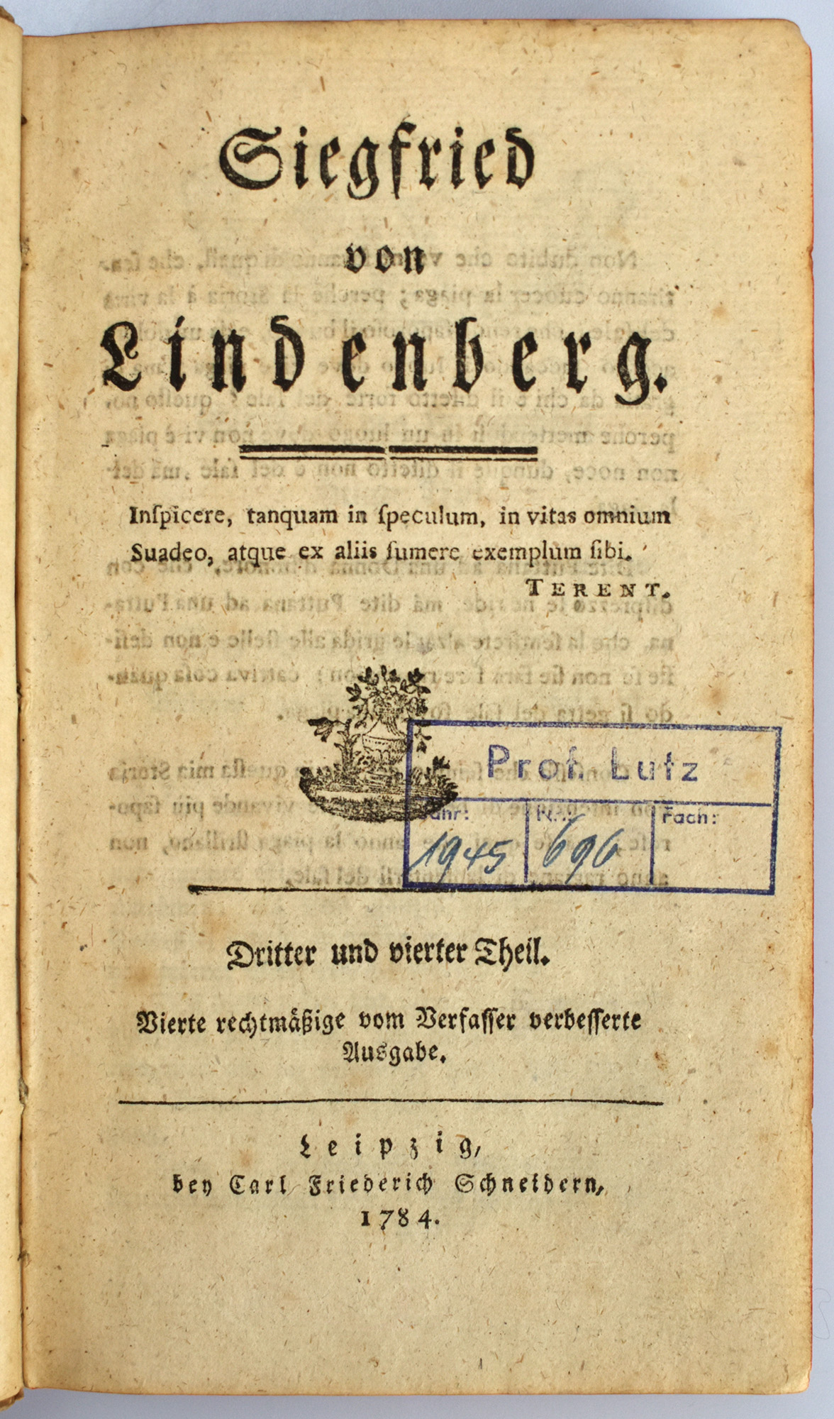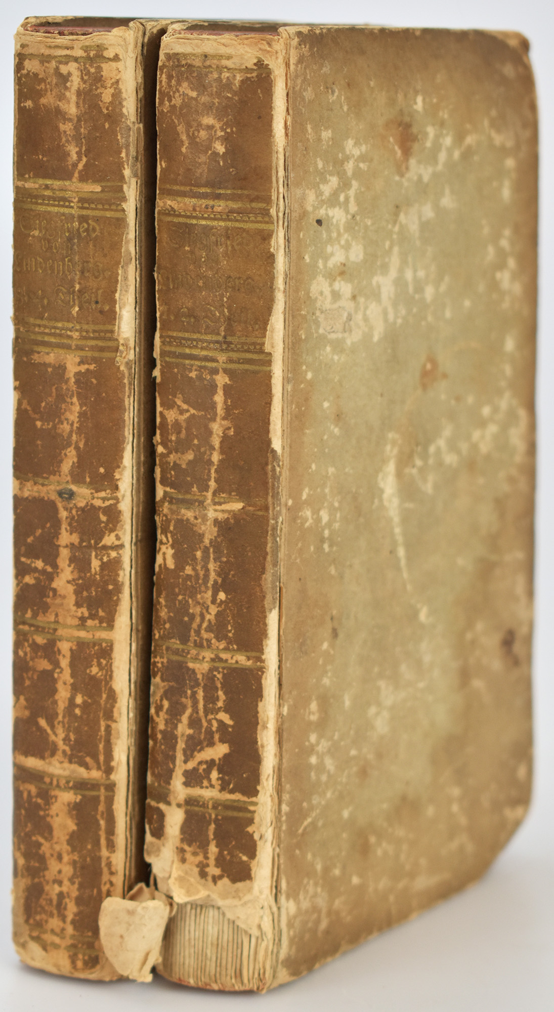 Müller, Johann Gottwerth: Siegfried von Lindenberg. 4 Teile (in 2 Bänden, komplett). Leipzig, Verlag Carl Friederich Schneider, 1784. Klein-8°. 18 x 11 cm. 356; 336 Seiten. Pappbände der Zeit mit goldgeprägtem Rückentitel, goldgeprägten Rückenfileten und Rundum-Rotschnitt.