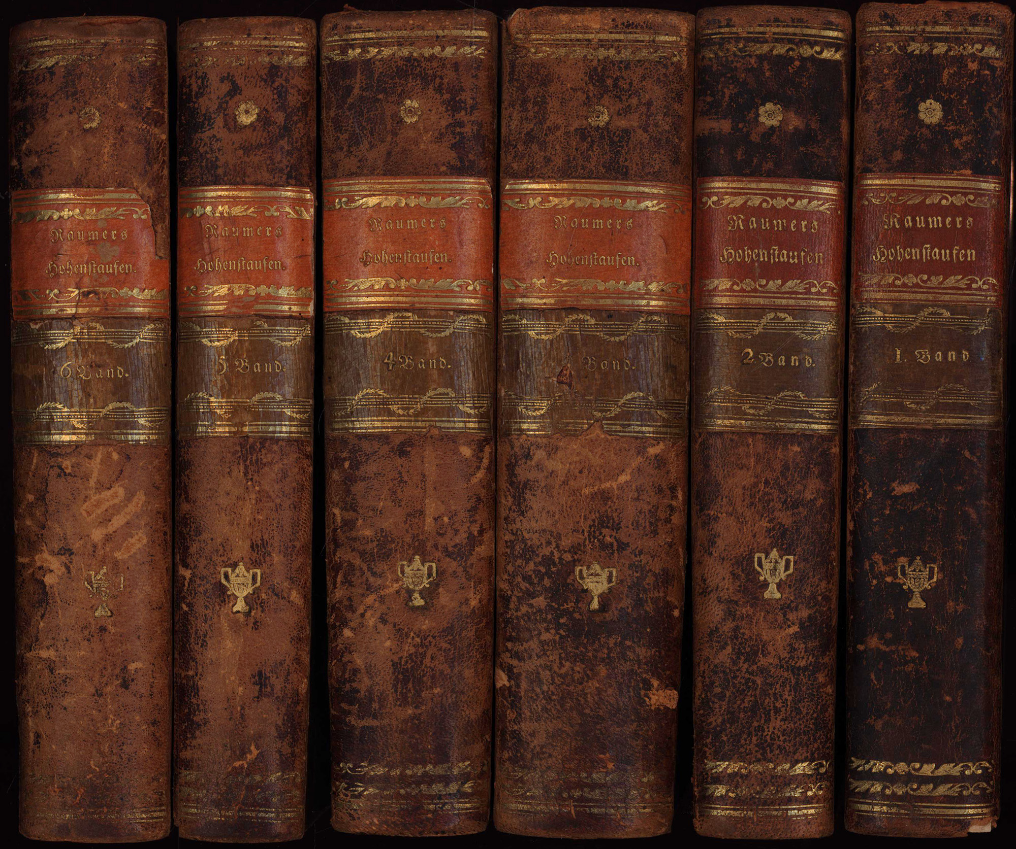 Raumer, Friedrich von: Geschichte der Hohenstaufen und ihrer Zeit. 6 Bände (komplett). Leipzig, Brockhaus Verlag, 1823-1825. 8°. 21,5 x 14 cm. XLVI, 597; X, 599; X, 757; XVI, 681; XVI, 519; XVI, 643 Seiten. Halblederbände mit goldgeprägten Rückentiteln und Bandzählung auf roten und grünen Lederschildchen und Rundum-Rotschnitt.