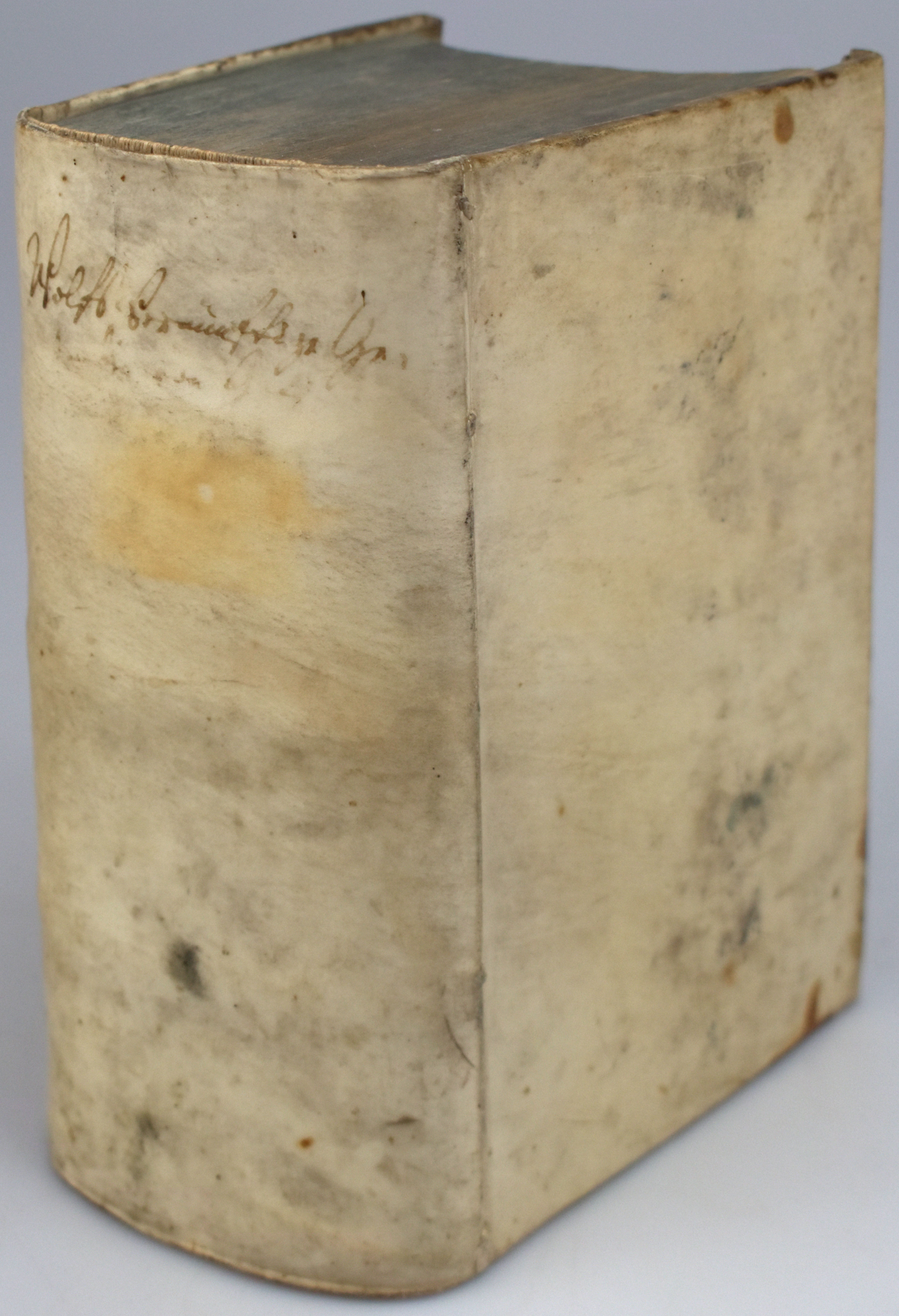 Vellum binding of the time with handwritten spine title in ink and all edges blue. Mixed edition (part 1 in the fifth edition, part 2 in the third edition). Both parts with engraved frontispieces (varying), title pages printed in red and black, and woodcut vignettes. Binding and edges somewhat rubbed and lightly soiled. Front flyleaf with old library stamp. Name in ink, in an old hand, on the title page. Pages in places lightly darkened. A near fine copy.