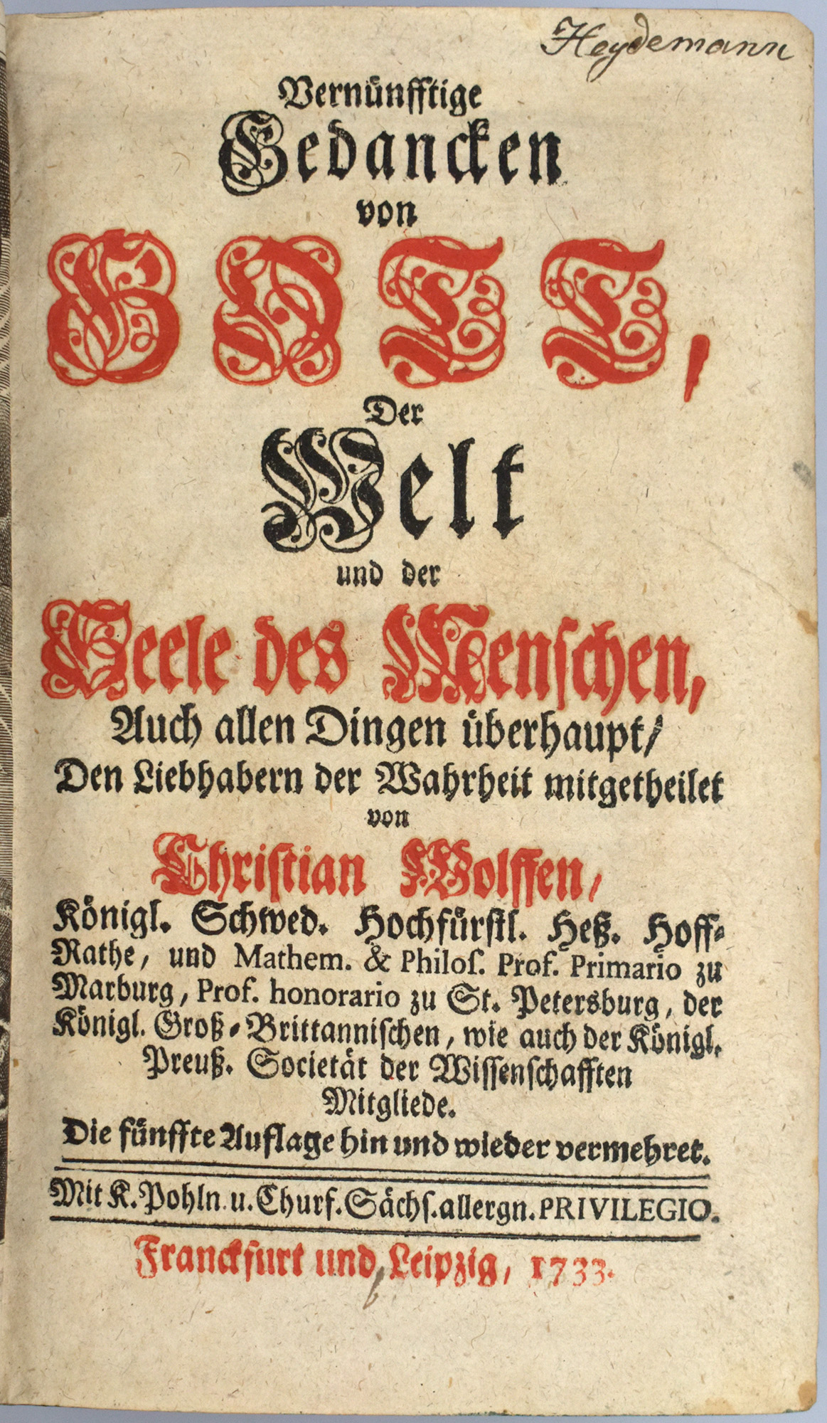 Wolff, Vernünfftige Gedancken von Gott. 2 Teile in 1 Band. Frankfurt, 1733.
