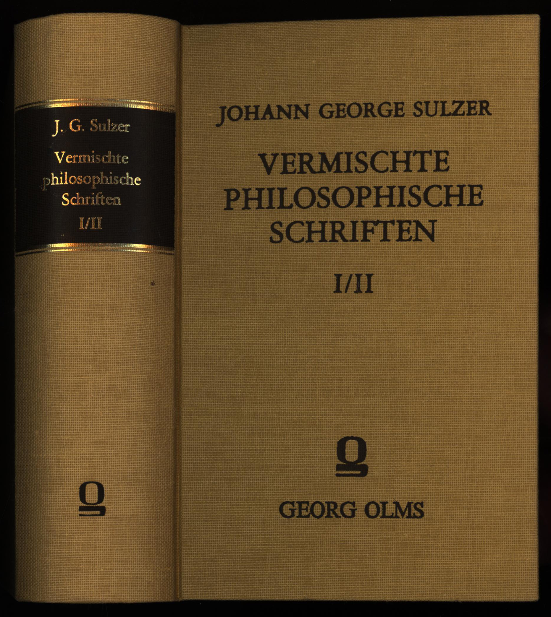 Sulzer, Johann Georg: Vermischte philosophische Schriften. 2 Teile (in 1 Band, komplett). Hildesheim, Olms Verlag, 1974. 8°. 17 x 12 cm. 4 Blatt, 398, 237 Seiten. Original-Leinenband.