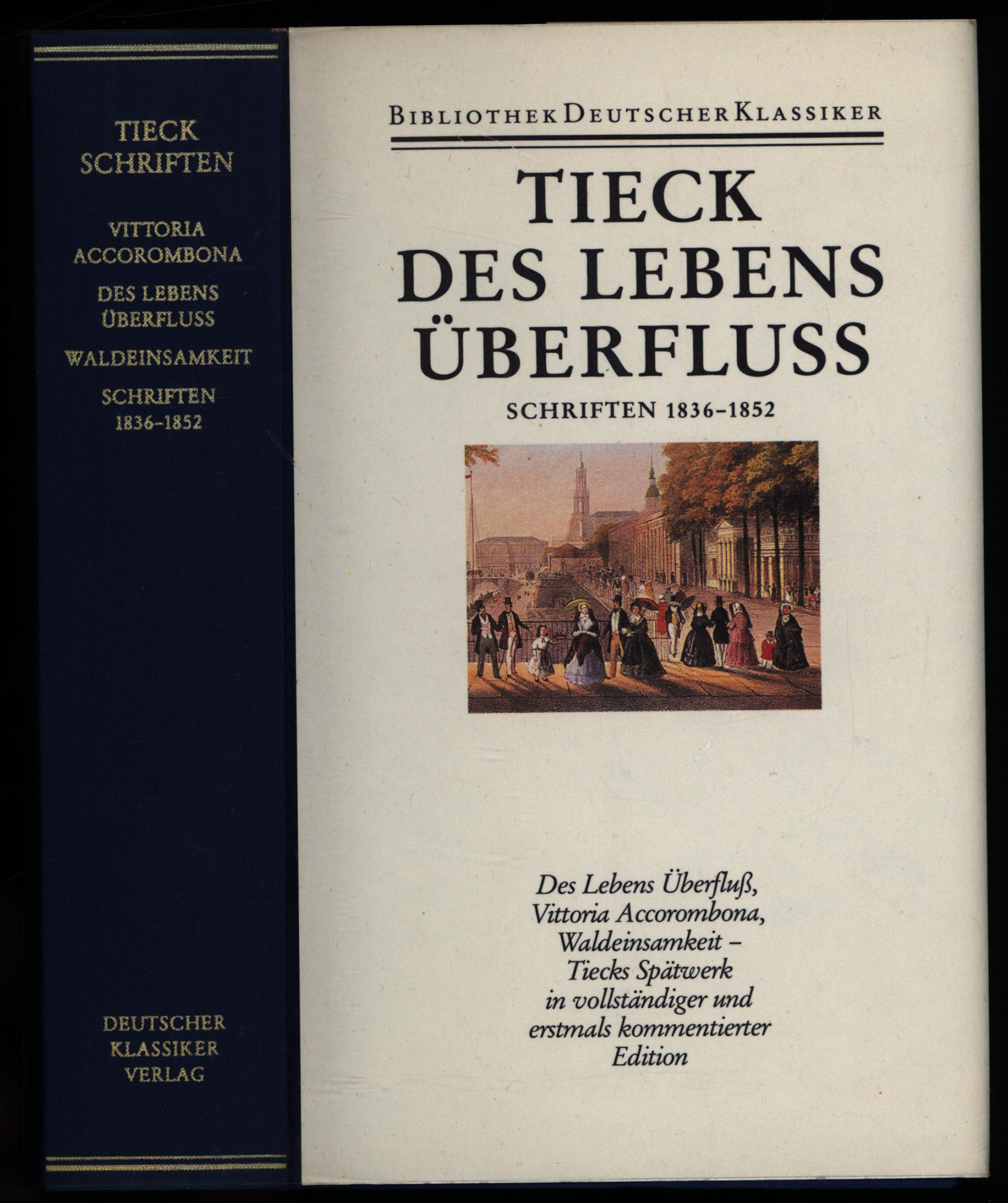 Tieck, Ludwig: Schriften 1836-1852. Herausgegeben von Uwe Schweikert. Frankfurt am Main, Deutscher Klassiker Verlag, 1986. Klein-8°. 18 x 11 cm. 1469 Seiten, 5 Blatt. Original-Leinenband. Original-Halbumschlag und Original-Klarsichtumschlag. Goldgeprägter Rückentitel. Dünndruck. (= Ludwig Tieck, Schriften in zwölf Bänden. Band 12. Bibliothek deutscher Klassiker. Band 13).