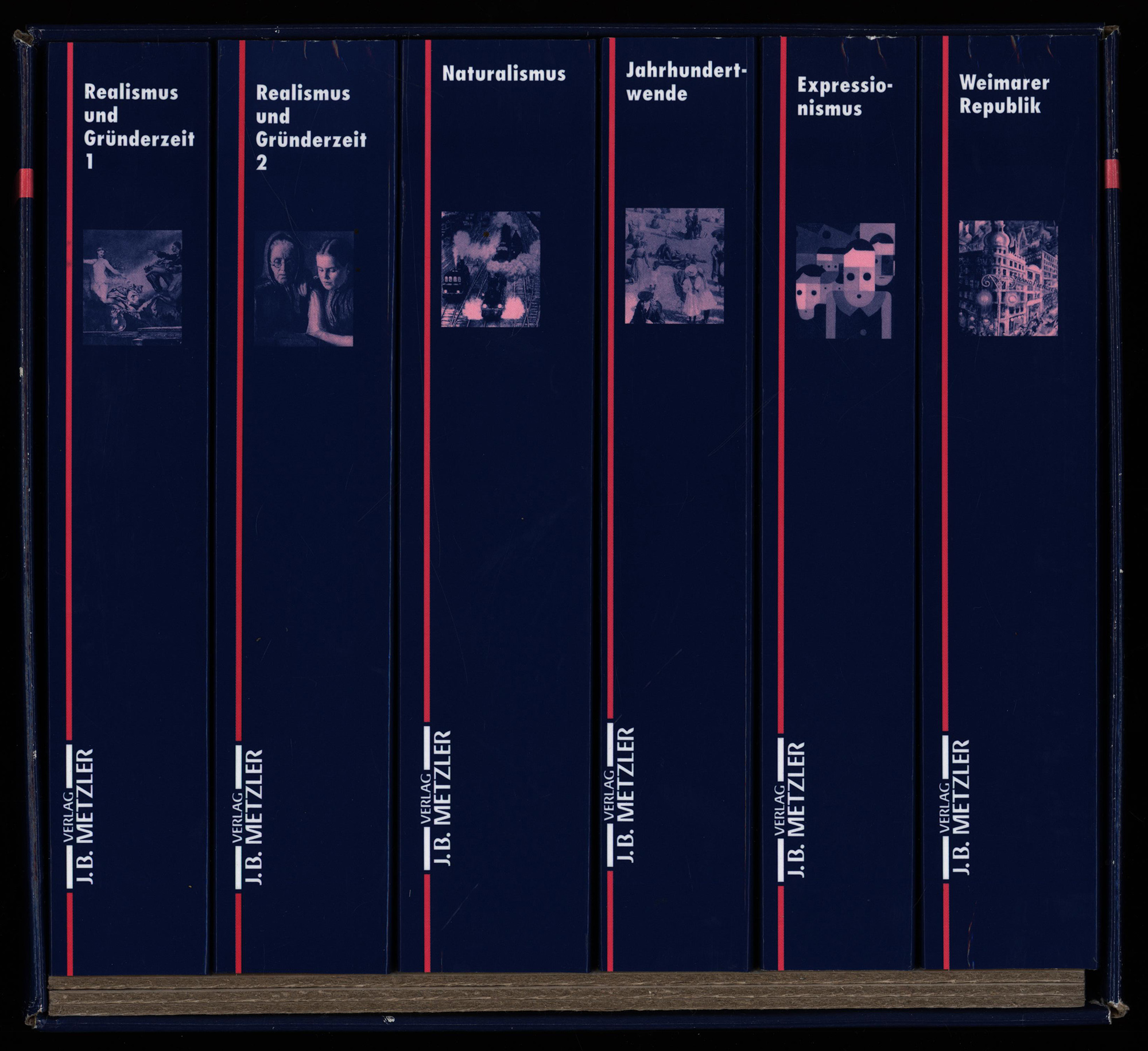 Bucher, Max (Hrsg.): Manifeste und Dokumente zur deutschen Literatur 1848-1933. Band 1 und 2: Realismus und Gründerzeit. Band 3: Naturalismus. Band 4: Jarhundertwende. Band 5: Expressionismus. Band 6: Weimarer Republik. Sonderausgabe in 6 Bänden (komplett). Stuttgart, Metzler Verlag 1981. Groß-8°. 23 x 15 cm. VIII, 502; XVI, 683; XXVIII, 808; XLII, 579; XXIII, 741; LIII, 709 Seiten. Original-Broschuren im Original-Pappschuber.