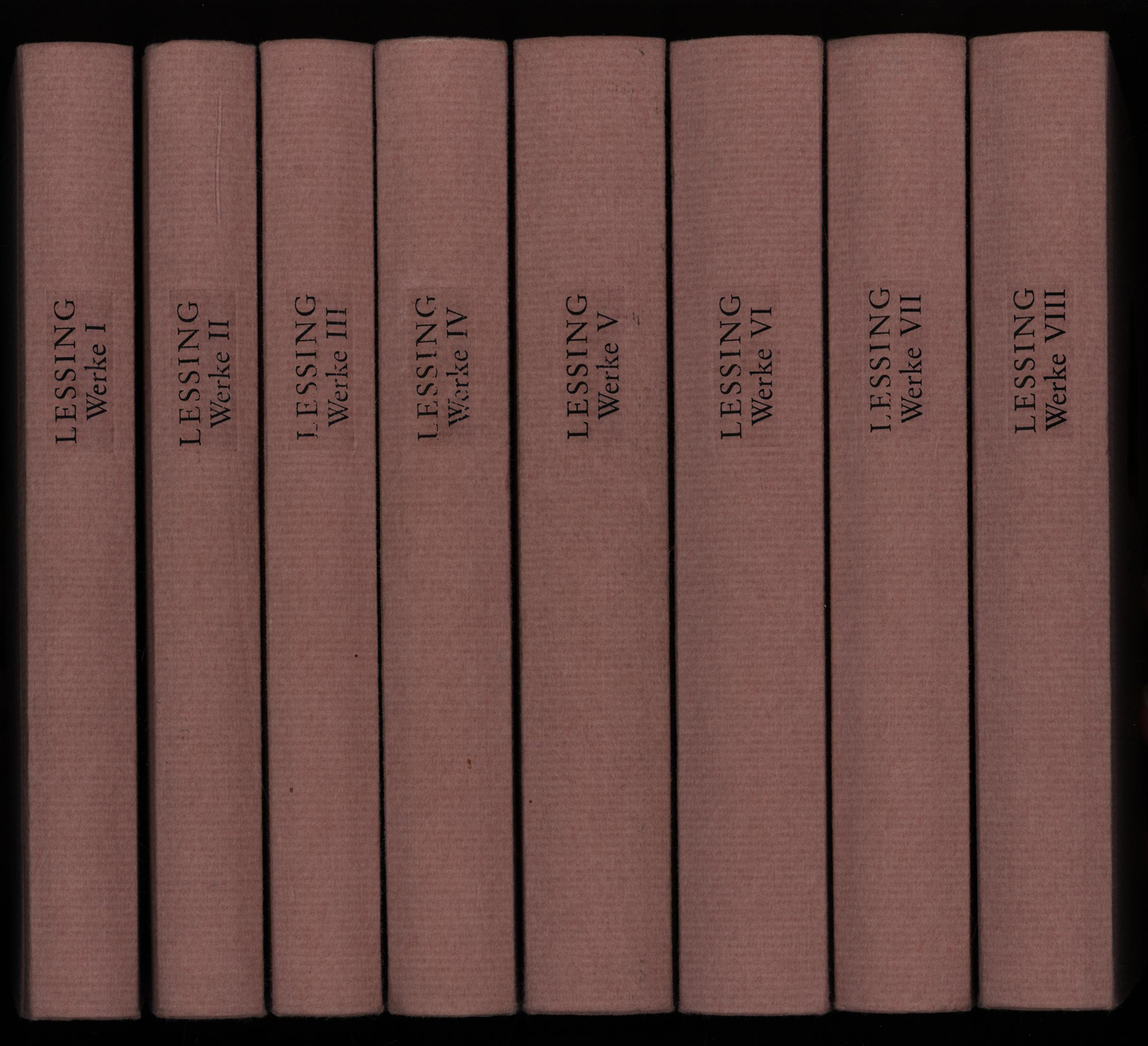 Lessing, Gotthold Ephraim: Werke. 1: Gedichte, Fabeln, Lustspiele. 2: Trauerspiele, Nathan der Weise, Dramatische Fragmente. 3: Frühe kritische Schriften. 4: Dramaturgische Schriften. 5: Literaturkritik, Poetik und Philologie. 6: Kunsttheoretische und kunsthistorische Schriften. 7: Theologiekritische Schriften I und II. 8: Theologiekritische Schriften III, Philosophische Schriften. 8 Bände (komplett). München, Carl Hanser Verlag, 1970. 8°. 20 x 12 cm. ca. 5500 Seiten. Original-Pappbände.