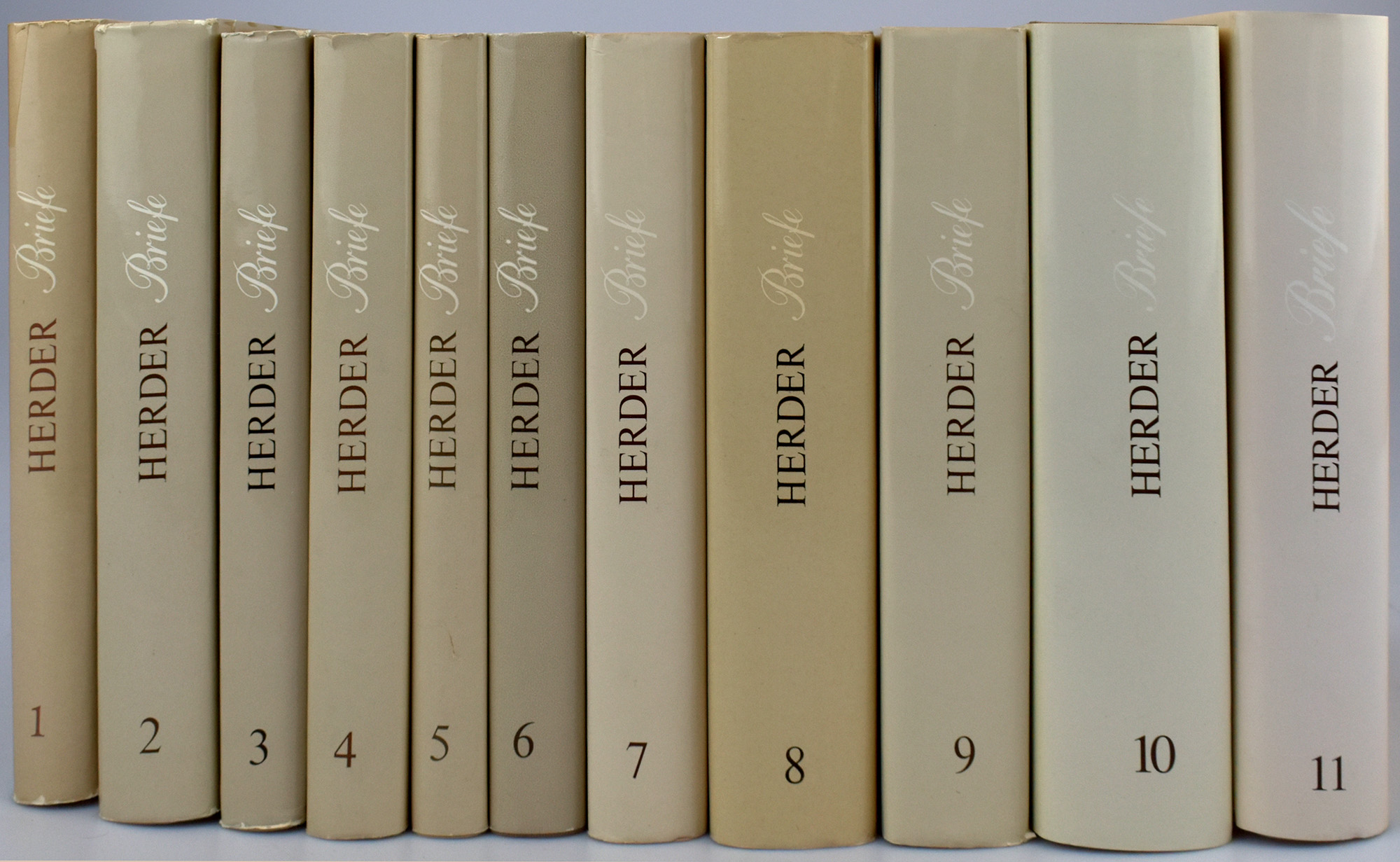 Herder, Johann Gottfried: Briefe. Gesamtausgabe 1763-1803. 11 Bände (10 Hauptbände und ein Kommentarband, komplett). Weimar, Verlag Hermann Böhlaus Nachfolger, 1977-2001. Groß-8°. 24,5 x 17,5 cm. 370; 384; 636; 361; 384; 366; 596; 712; 839; X, 865; 664 Seiten. Original-Leinenbände mit Original-Schutzumschlägen.