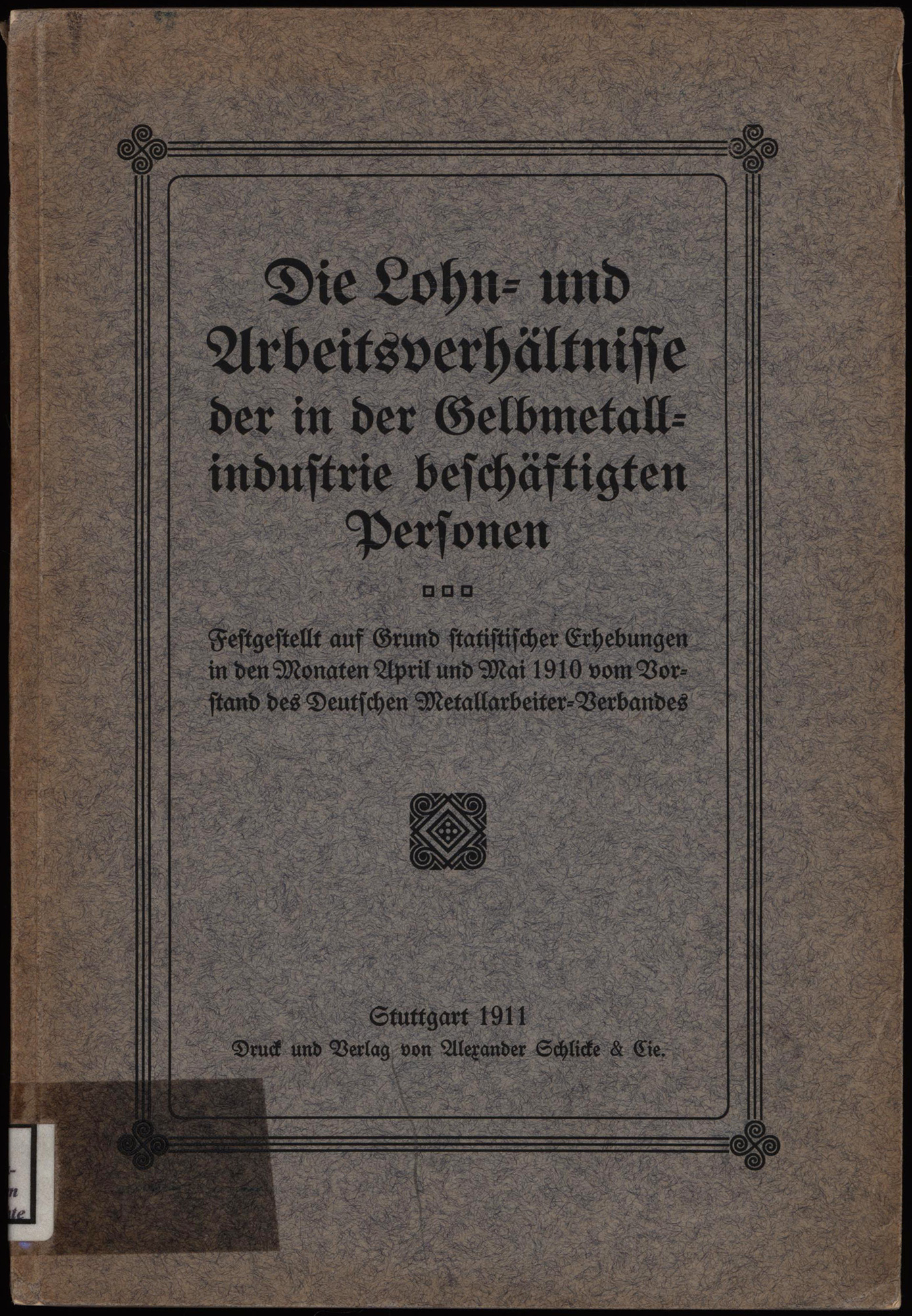Die Lohn- und Arbeitsverhältnisse der in der Gelbmetallindustrie beschäftigten Personen. Festgestellt auf Grund statistischer Erhebungen in den Monaten April und Mai 1910. Stuttgart, Verlag von Alexander von Schlicke, 1911. Groß-8°. 23 x 16 cm. VIII, 208 Seiten. Original-Interimsbroschur.