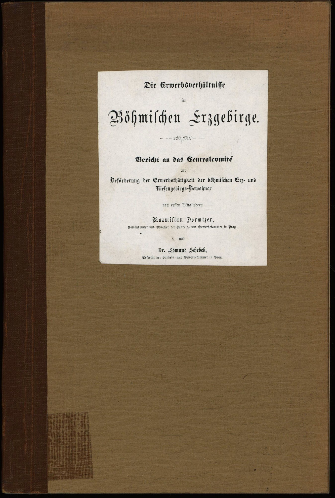 Dormizer, Maximilian und Schebek, Edmund: Die Erwerbsverhältnisse im Böhmischen Erzgebirge. Bericht an das Centralcomité zur Beförderung der Erwerbsthätigkeit der böhmischen Erz- und Riesengebirgs-Bewohner. Prag, Mercy Verlag, 1862. 8°. 22,5 x 15 cm. [4] Blatt, 231 Seiten. Privater Einband mit Rücken aus Gewebeband, Pappdeckeln und aufkaschiertem Deckelschild.