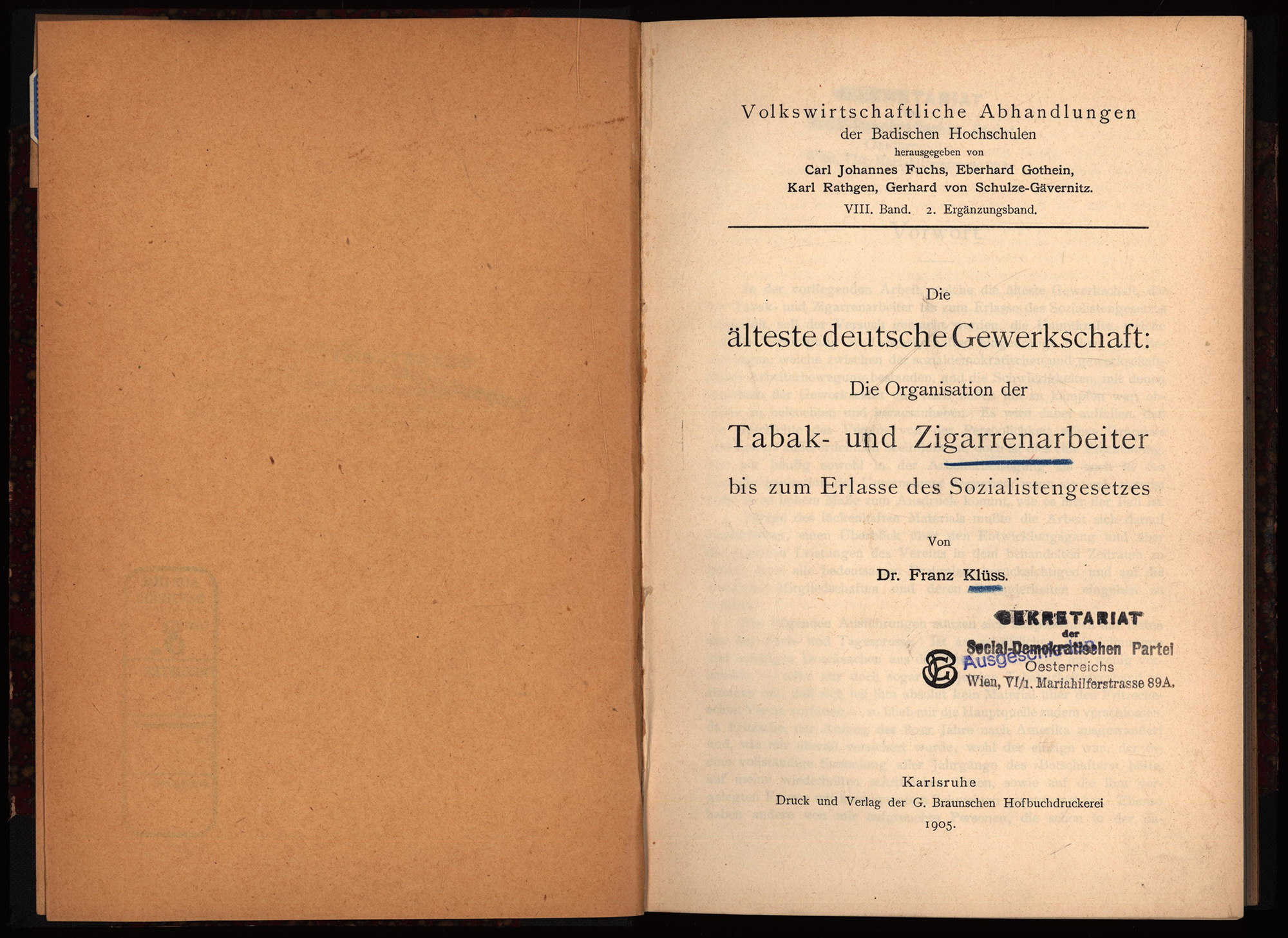 Klüss, Franz: Die älteste deutsche Gewerkschaft. Die Organisation der Tabak- und Zigarrenarbeiter bis zum Erlasse des Sozialistengesetzes. Karlsruhe, Verlag der Braunschen Hofdruckerei, 1905. Groß-8°. 24 x 16,5 cm. 68 Seiten. Halbleinenband der Zeit mit goldgeprägtem Rückentitel, marmoriertem Deckelbezug und Sprengschnitt. (= Volkswirtschaftliche Abhandlungen der badischen Hochschulen, Band 8, Ergänzungsband 2).