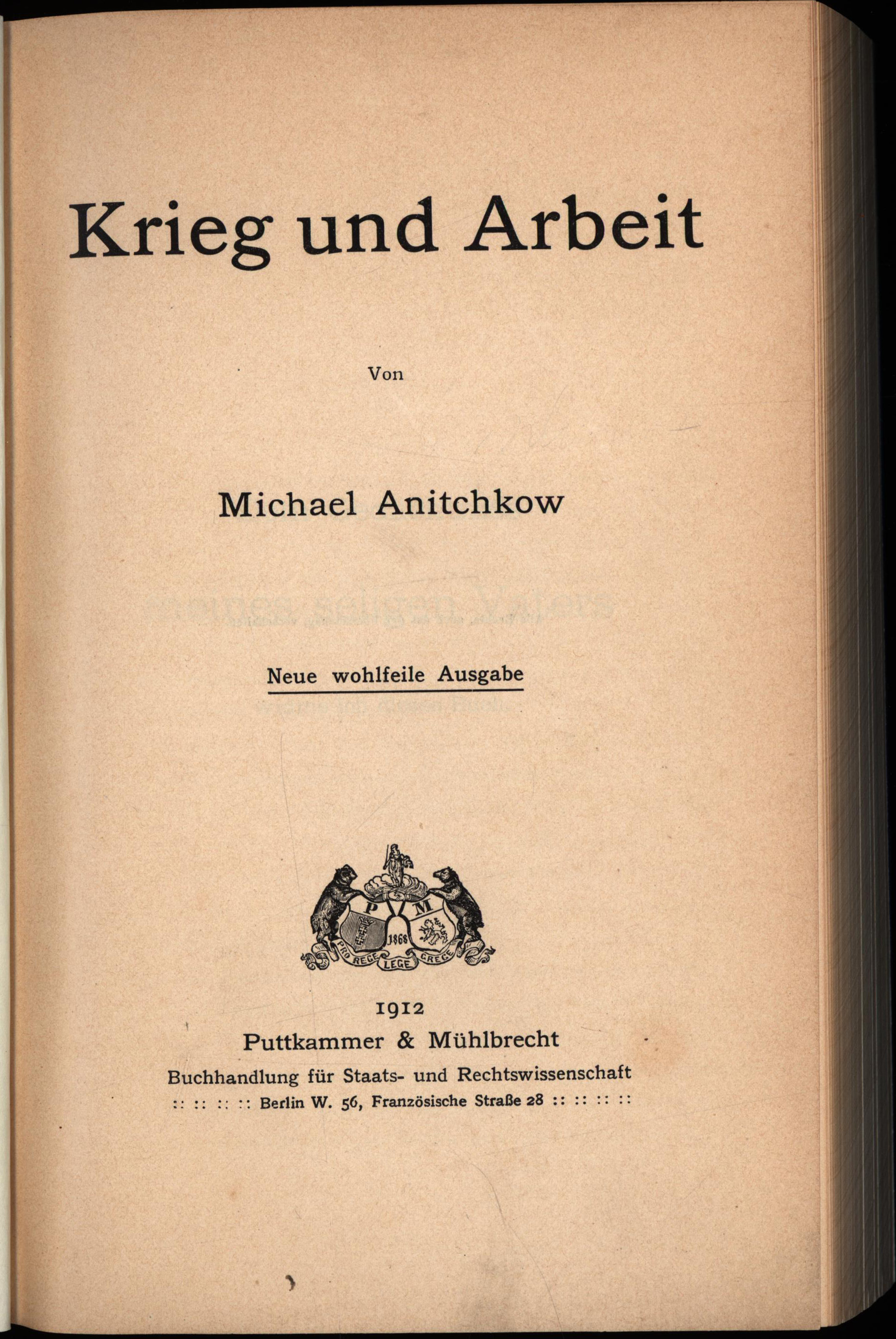 Anitchkow [Anickov], Michael: Krieg und Arbeit. Berlin, Verlag Puttkammer & Mühlbrecht, 1912. Groß-8°. 23,5 x 15 cm. XI, 604 Seiten. Bibliothekseinband in Buckram mit aufkaschierter Original-Broschur auf Vorderdeckel.