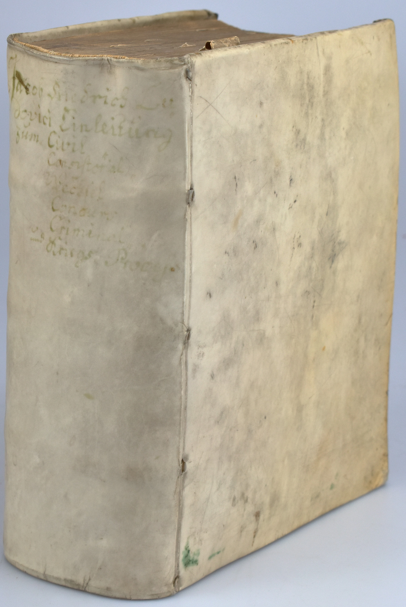 Vellum binding of the time with manuscript spine title in an early hand. Stintzing-Landsberg III/1, 136. Includes the following works from the widely circulated „Einleitungen“ collection of the jurist and court councillor Jakob Friedrich Ludovici (1661-1723), most of which were written during his tenure in Halle: 1) Einleitung zum Civil-Prozeß. 4th, revised edition, Halle, 1714. [15] leaves, 384 pages. With red and black title page, engraved portrait frontispiece, and woodcut vignettes. 2) Einleitung zum Consistorial-Proceß. 1st edition. Halle, 1713. [8] leaves, 182 pages, [8] leaves, with woodcut vignettes. 3) Einleitung zum Wechsel-Proceß. 2nd edition. Halle, 1713. [8] leaves, 238 pages, [11] leaves. With red and black title page and woodcut vignettes. 4) Einleitung zum Concurs-Proceß. 1st edition. Halle, 1713. [6] leaves, 103 pages, [4] leaves. 5) Einleitung zum Peinlichen Proceß. 4th edition. Halle, 1714. [6] leaves, 160 pages. With woodcut vignettes. 6) Einleitung zum Kriegs-Proceß. 1st edition. Halle, 1715. [10] leaves, 220 pages, [8] leaves. With red and black title page and woodcut vignettes. From the library of the von Nitzschwitz family. Binding slightly rubbed, spine title faded. Pages lightly darkened, with occasional light foxing and sporadic contemporary ink marginalia. Title pages with faint remnants of privately mounted paper thumb tabs. Final blank leaf fully inscribed in early ink. Near fine copy.