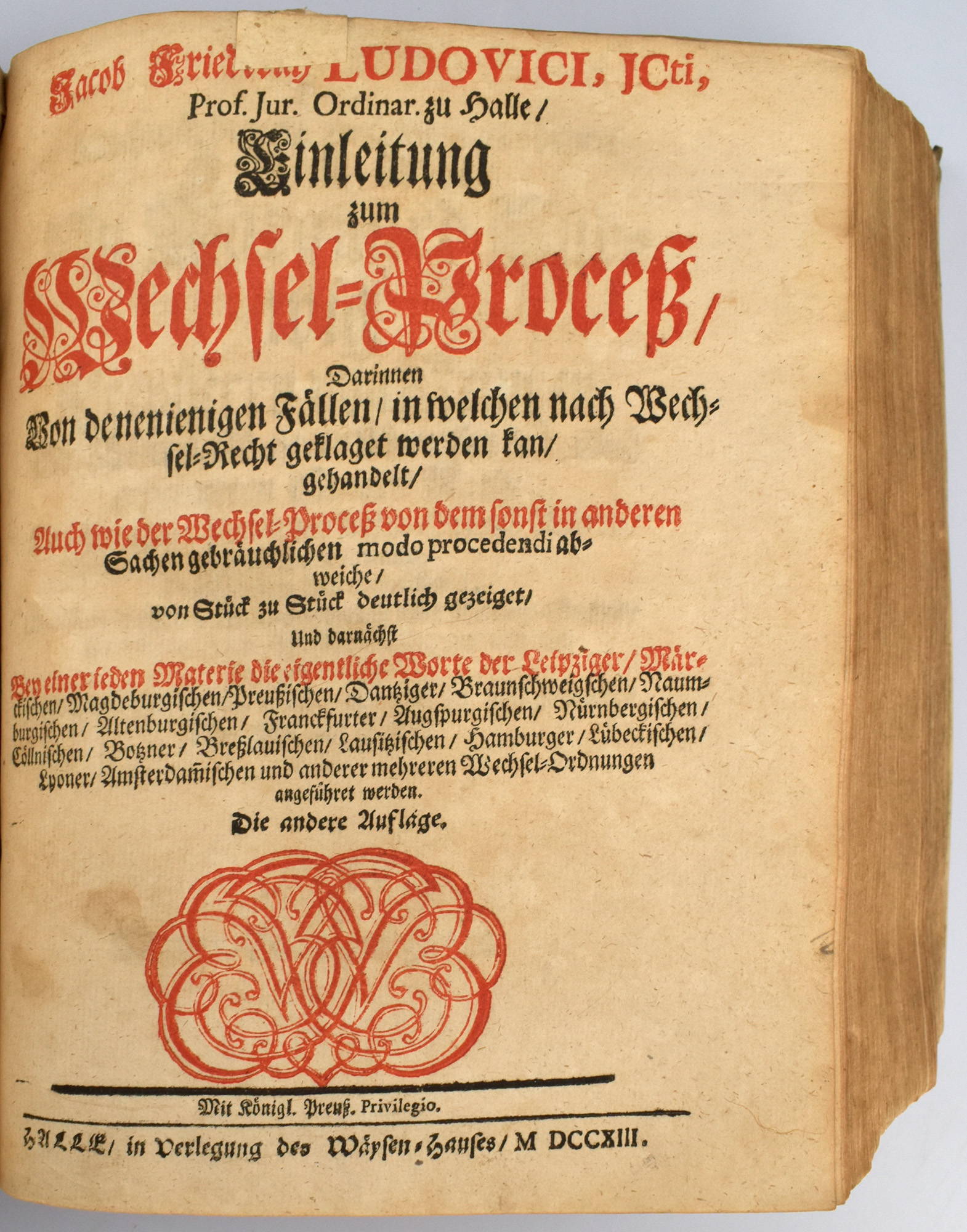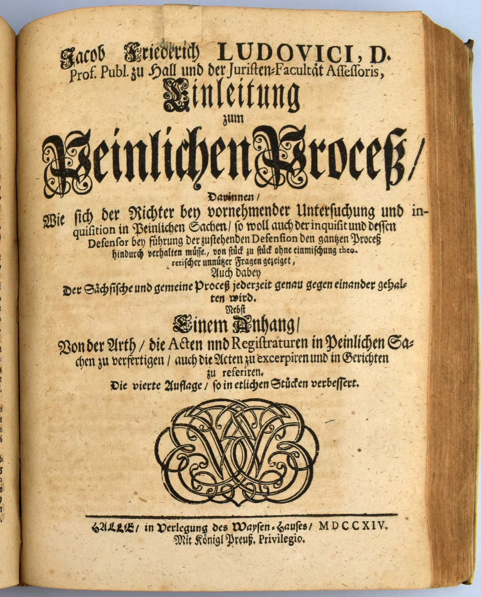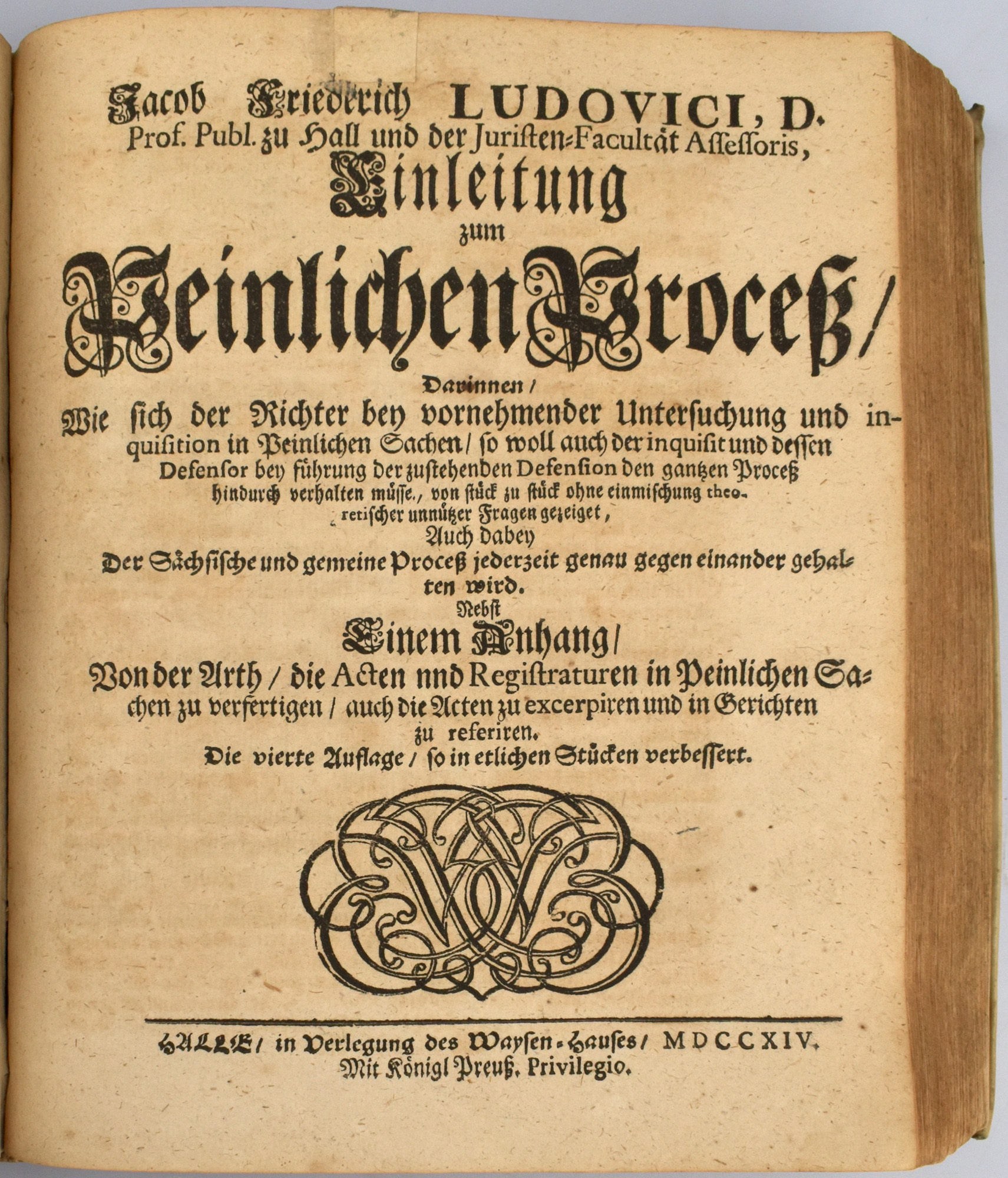 Stintzing-Landsberg III/1, 136. Enthält die folgenden Werke aus der weithin verbreiteten ‚Einleitungen’-Sammlung des Juristen und Hofrats Jakob Friedrich Ludovici (1661-1723), deren Texte zum Großteil während seiner Hallenser Lehrtätigkeit verfasst wurden: 1) Einleitung zum Civil-Prozeß. 4., verbesserte Auflage. Halle, 1714. 15 Blatt, 384 Seiten. Mit Titelblatt in Rot und Schwarz, gestochenem Porträt-Frontispiz und Holzschnittvignetten. 2) Einleitung zum Consistorial-Proceß. 1. Auflage. Halle, 1713. [8] Blatt, 182 Seiten, [8] Blatt. Mit Holzschnittvignetten. 3) Einleitung zum Wechsel-Proceß. 2. Auflage. Halle, 1713. [8] Blatt, 238 Seiten, [11] Blatt. Mit in Rot und Schwarz gedrucktem Titelblatt und Holzschnittvignetten. 4) Einleitung zum Concurs-Proceß. 1. Auflage. Halle, 1713. [6] Blatt, 103 Seiten, [4] Blatt. 5) Einleitung zum Peinlichen Proceß. 4. Auflage. Halle, 1714. [6] Blatt, 160 Seiten. Mit Holzschnittvignetten. 6) Einleitung zum Kriegs-Proceß. Halle, 1715. 1. Auflage. [10] Blatt, 220 Seiten, [8] Blatt. Mit in Rot und Schwarz gedrucktem Titelblatt und Holzschnittvignetten. Exemplar aus dem Besitz der Familie von Nitzschwitz.