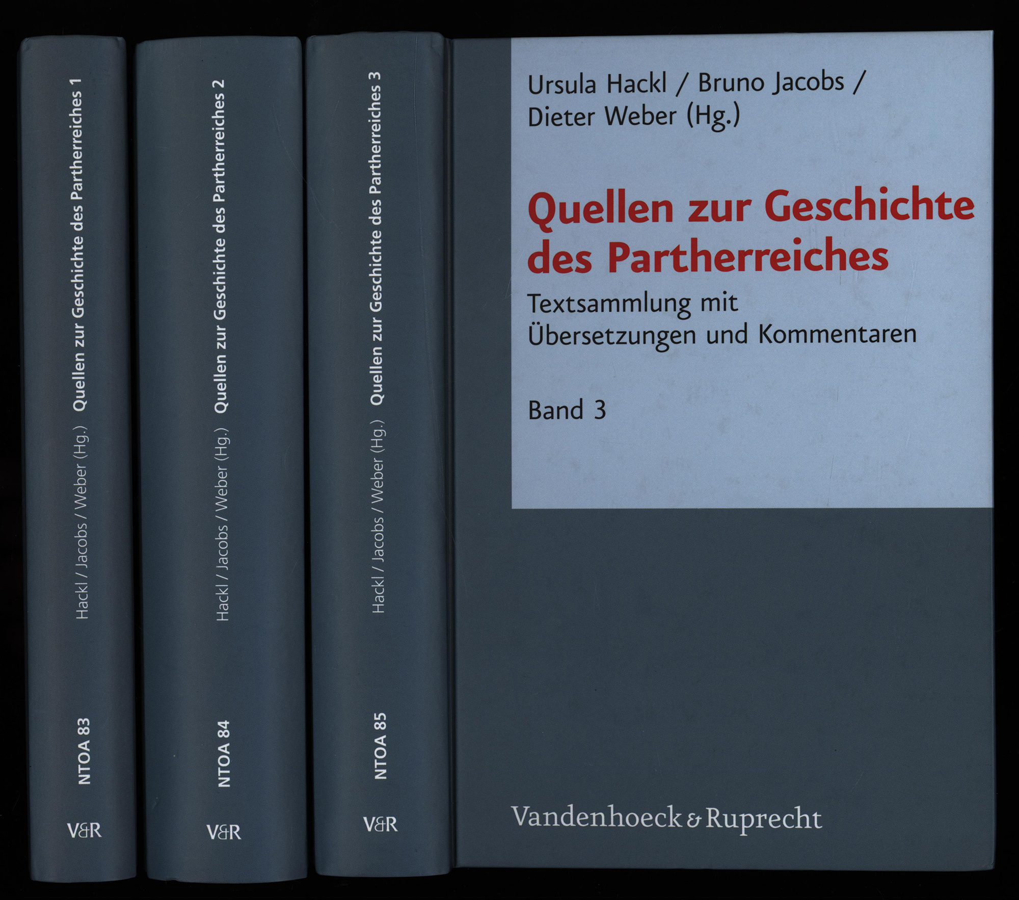Hackl, Ursula; Jacobs, Bruno; Weber, Dieter [Hrsg.]: Quellen zur Geschichte des Partherreiches. Textsammlung mit Übersetzungen und Kommentaren. Band 1: Prolegomena, Abkürzungen, Bibliographie, Einleitung, Indices, Karten, Tafeln. Beiträge von Ursula Hackl, Bruno Jacobs, Dieter Weber. Band 2: Griechische und lateinische Texte, Parthische Texte, Numismatische Evidenz. Beiträge von Daniel Keller, Lukas Thommen, Dieter Weber. Band 3: Keilschriftliche Texte, Aramäische Texte, Armenische Texte, Arabische Texte, Chinesische Texte. Beiträge von Barbara Böck, Uta Golze, Gudrun Schubert, Kerstin Storm, Guisto Traina, Markus Zehnder. 3 Bände (komplett). Göttingen, Vandenhoeck & Ruprecht, 2010. Groß-8°. 24 x 16 cm. CXLIII, 240 Seiten, [8] Blatt, X, 639 Seiten, VIII, 512 Seiten. Gebundene Original-Pappbände. (= Novum testamentum et orbis antiquus. Studien zur Umwelt des Neuen Testaments, Band 83-85).