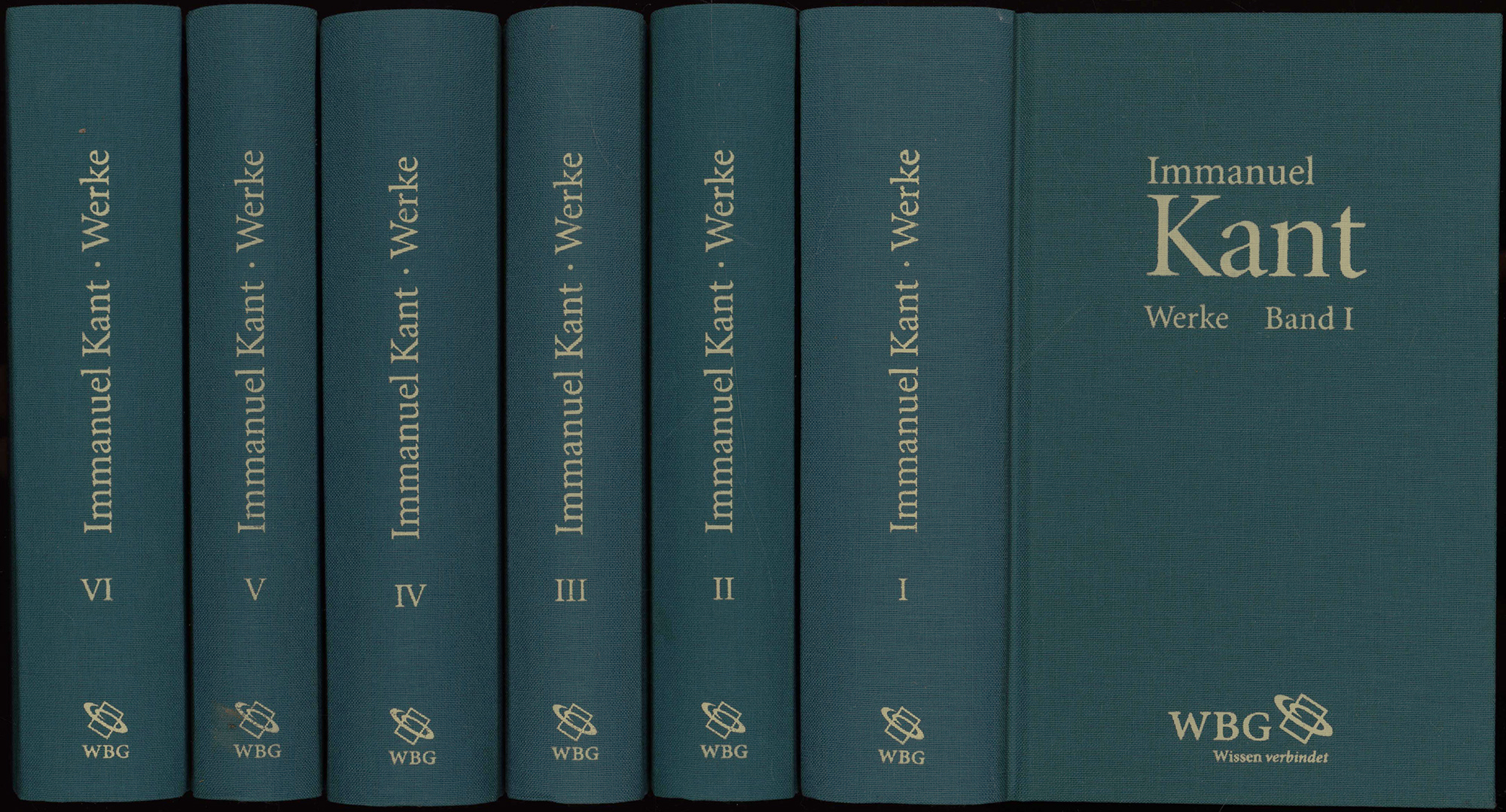 Kant, Immanuel: Werke in sechs Bänden. Herausgegeben von Wilhelm Weischedel. Band 1: Vorkritische Schriften bis 1768. Band 2: Kritik der reinen Vernunft. Band 3: Schriften zur Metaphysik und Logik. Band 4: Schriften zur Ethik und Religionsphilosophie. Band 5: Kritik der Urteilskraft und Schriften zur Naturphilosophie. Band 6: Schriften zur Anthropologie, Geschichtsphilosophie, Politik und Pädagogik. 6 Bände (komplett). Darmstadt, Wissenschaftliche Buchgesellschaft, 2011. 8°. 20 x 12 cm. 1024, 724, 696, 896, 633 und 849 Seiten. Original-Leinenbände.