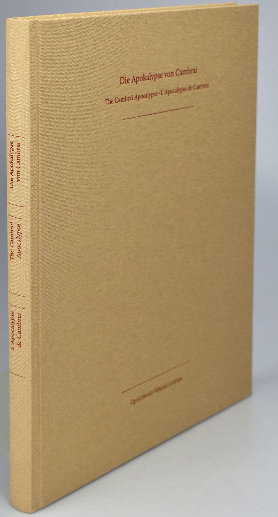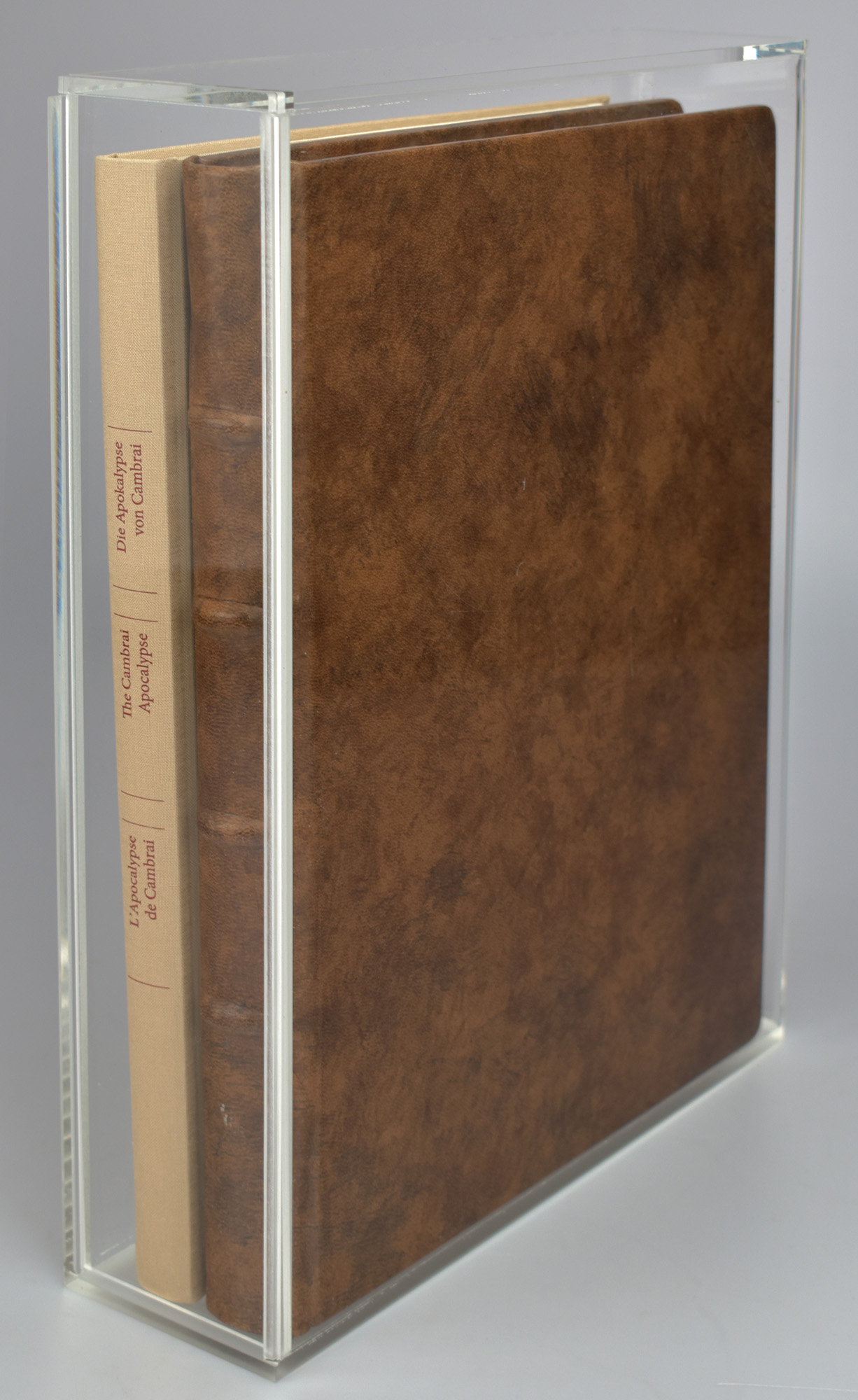 Die Apokalypse von Cambrai. 2 Bände (Faksimile und Kommentarband, komplett). Luzern, Quaternio Verlag, 2017. 4°. 33 x 24,5 cm. 49 Blatt; 232 Seiten. Original-Lederband auf 4 Bünden und Original-Leinenband mit Lesebändchen gemeinsam im Original-Acrylschuber. Die Apokalypse von Cambrai : Ms. B 386, Cambrai, Médiathèque d’Agglomération.
