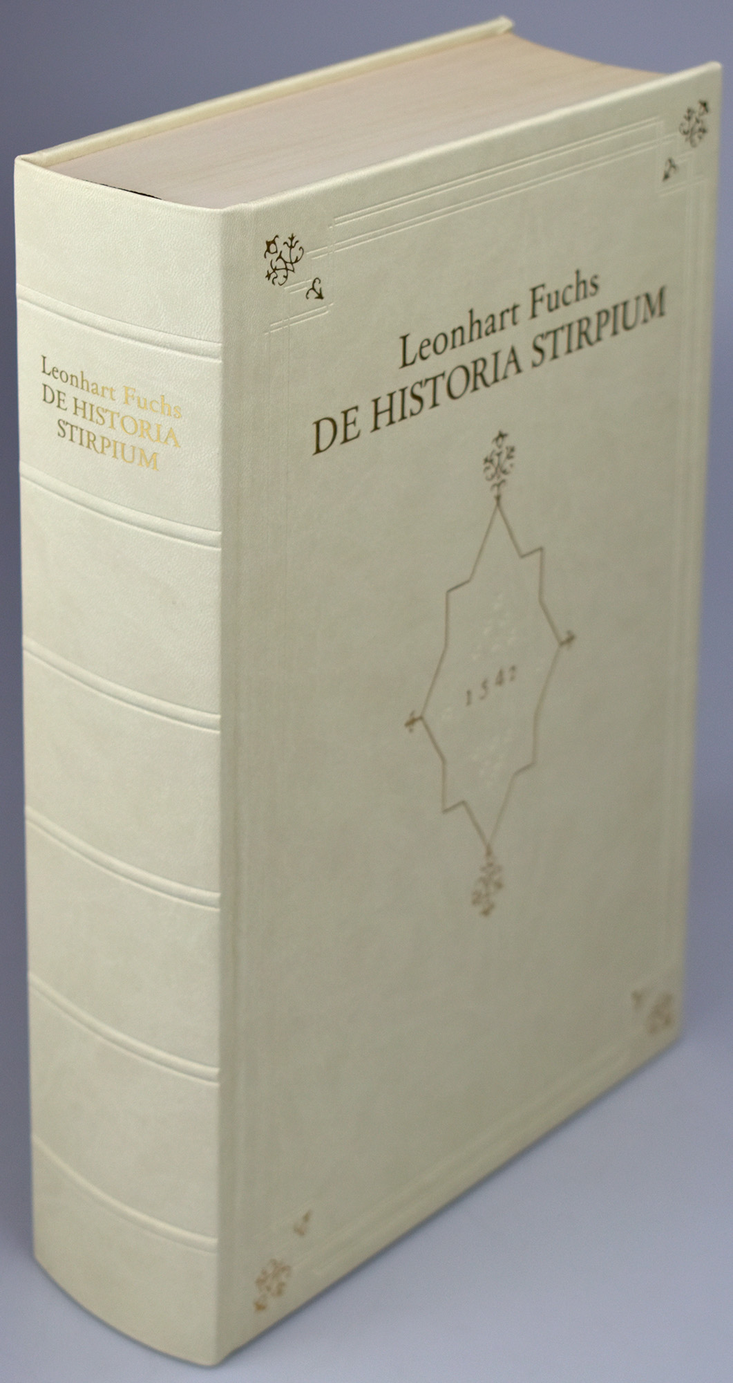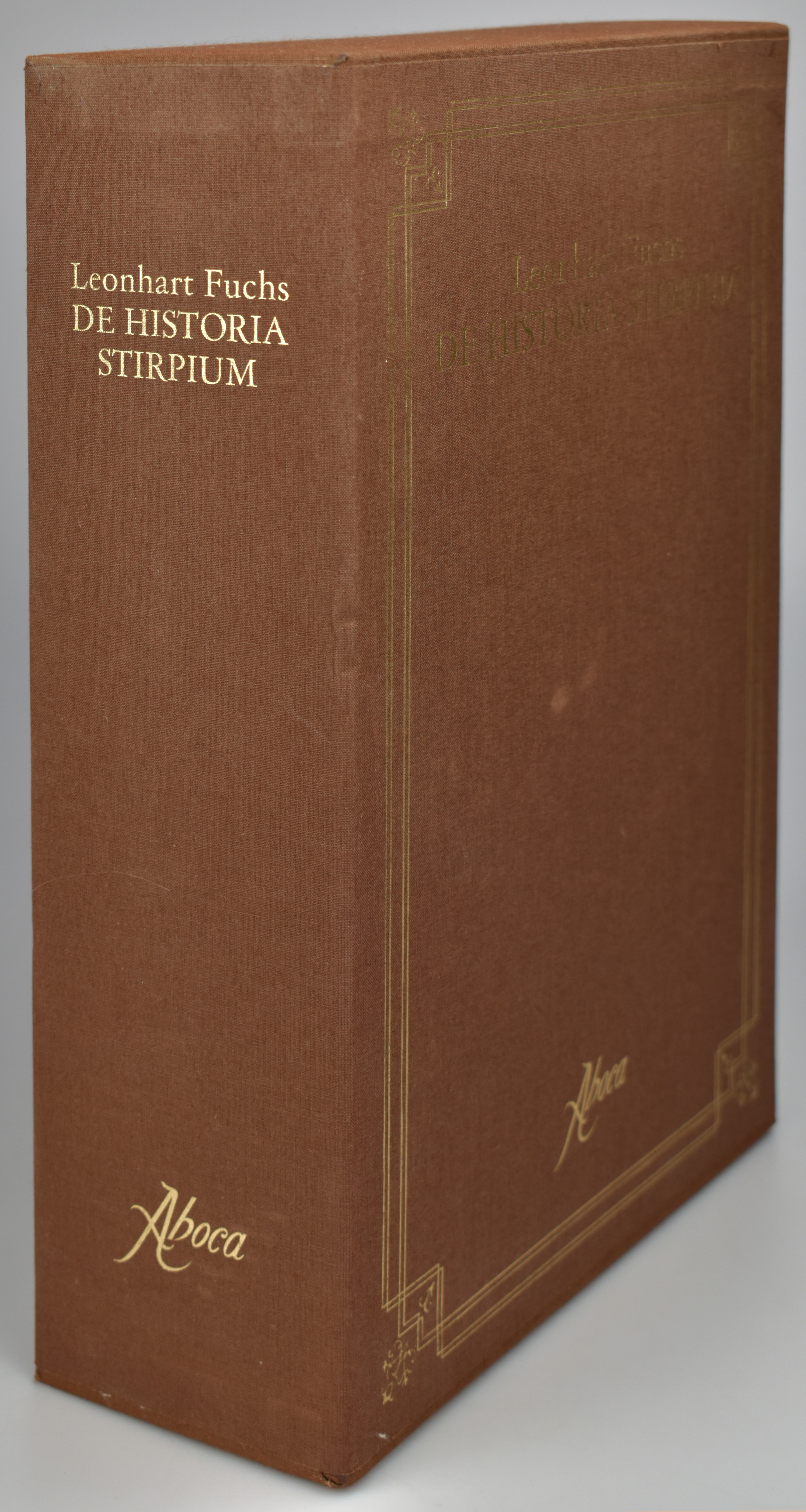 Fuchs, Leonhart: De historia stirpium. 2 Bände (Faksimile und Kommentarband, komplett). Sansepolcro, Verlag Aboca, 2017. 36,5 x 23,5 x 9,5 cm. [15] Blatt, 895 Seiten, [1] Blatt; 62 Seiten, [1] Blatt. Original-Lederband mit Gold- und Blindprägung und Original-Halbleinenband mit Deckelabbildung in Farbe gemeinsam in Original-Leinenschuber mit goldgeprägtem Titel.