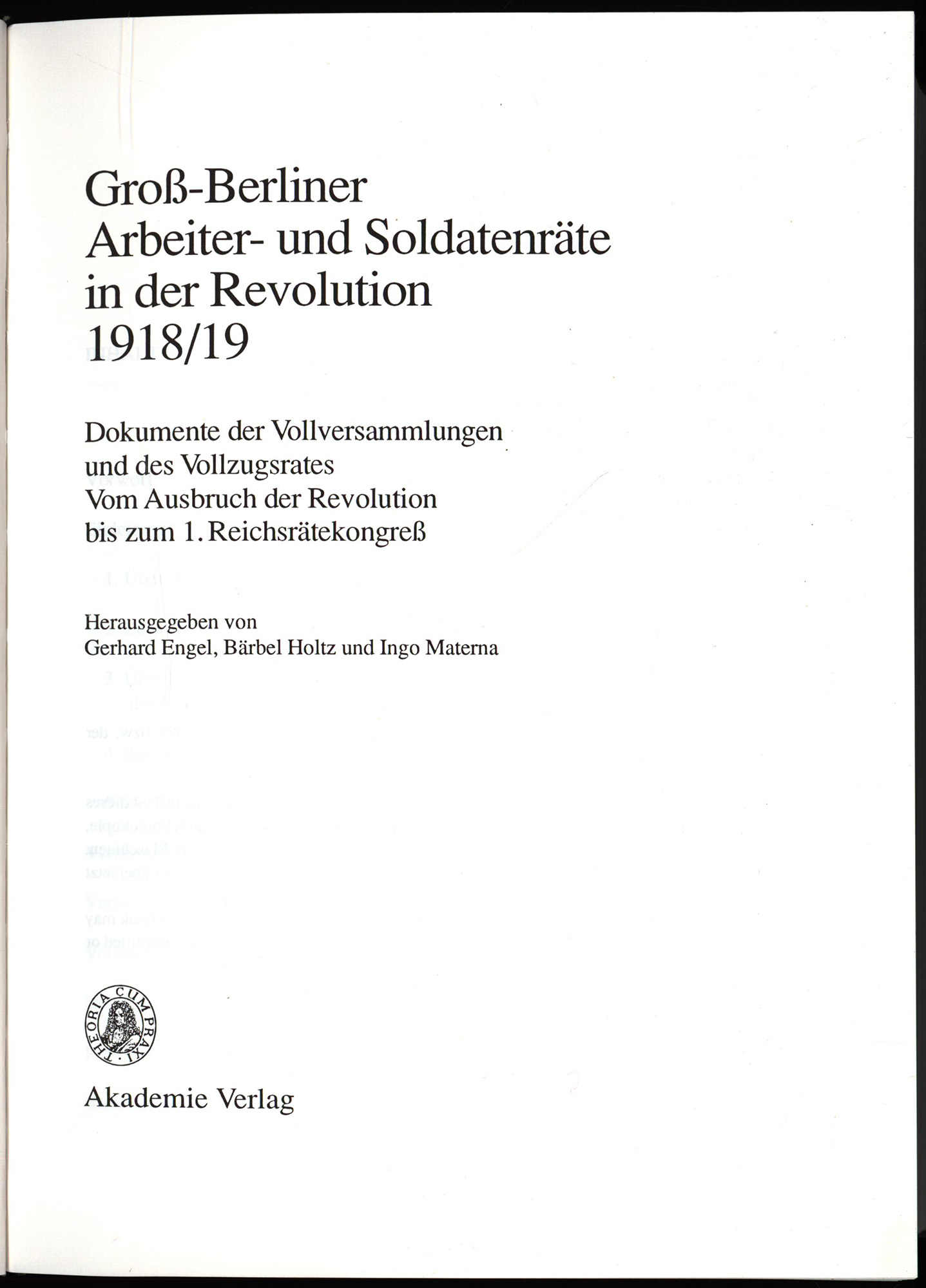 Engel, Gerhard (Hrsg.): Gross-Berliner Arbeiter- und Soldatenräte in der Revolution 1918/19. Dokumente der Vollversammlungen und des Vollzugsrates. 3 Bände (komplett). Berlin, Akademie Verlag, 1993-2002. Groß-8°. 24,5 x 18 cm. LXXXVI, 958; XLIV, 888; XLVIII, 885 Seiten. Original-Pappbände.