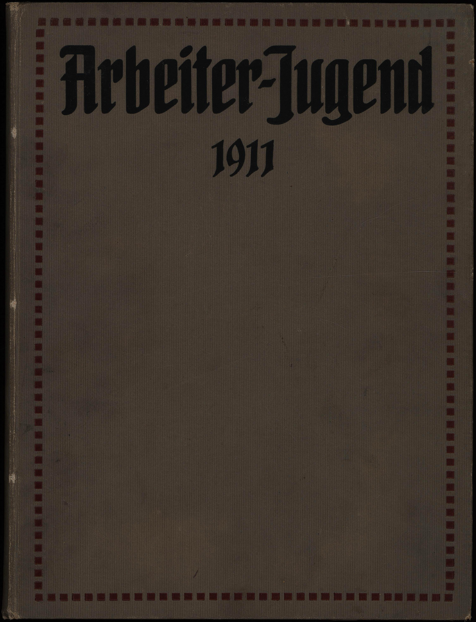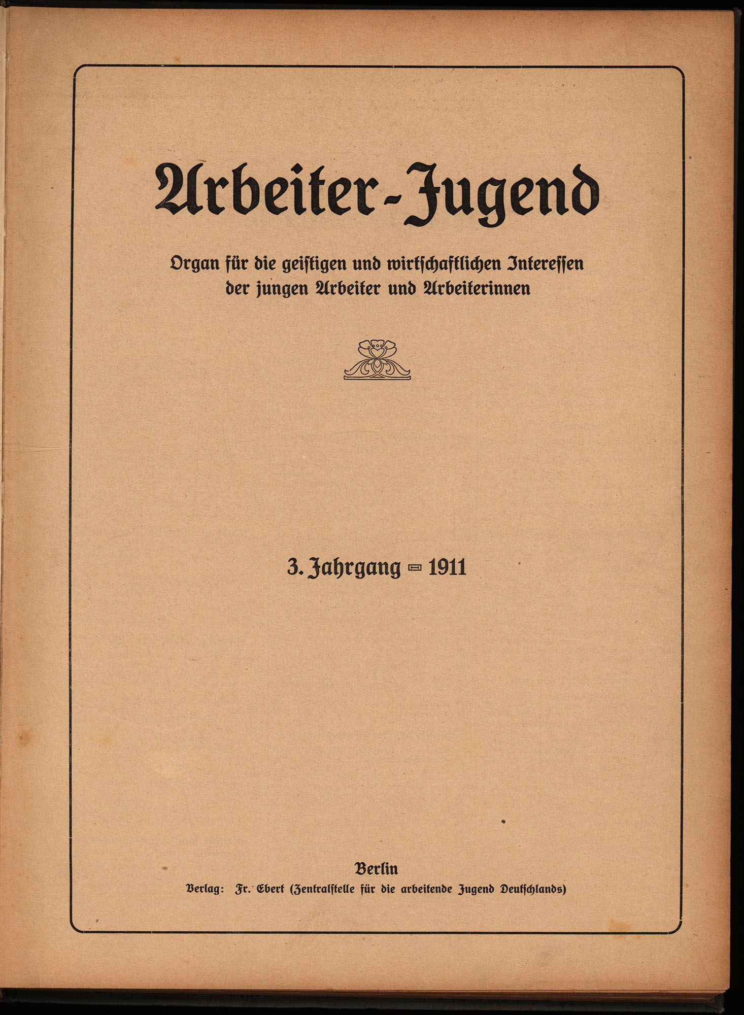 Arbeiter-Jugend. Organ für die geistigen und wirtschaftlichen Interessen der jungen Arbeiter und Arbeiterinnen. 3. Jahrgang 1911. 26 Nummern (in 1 Band, komplett). Berlin, Verlag Fr. Ebert, 1911. 4°. 33 x 25,5 cm. [2] Blatt, 416 Seiten. Original-Leinenband der Zeit mit schwarzgeprägtem Deckeltitel in rotgeprägtem Zierrahmen.