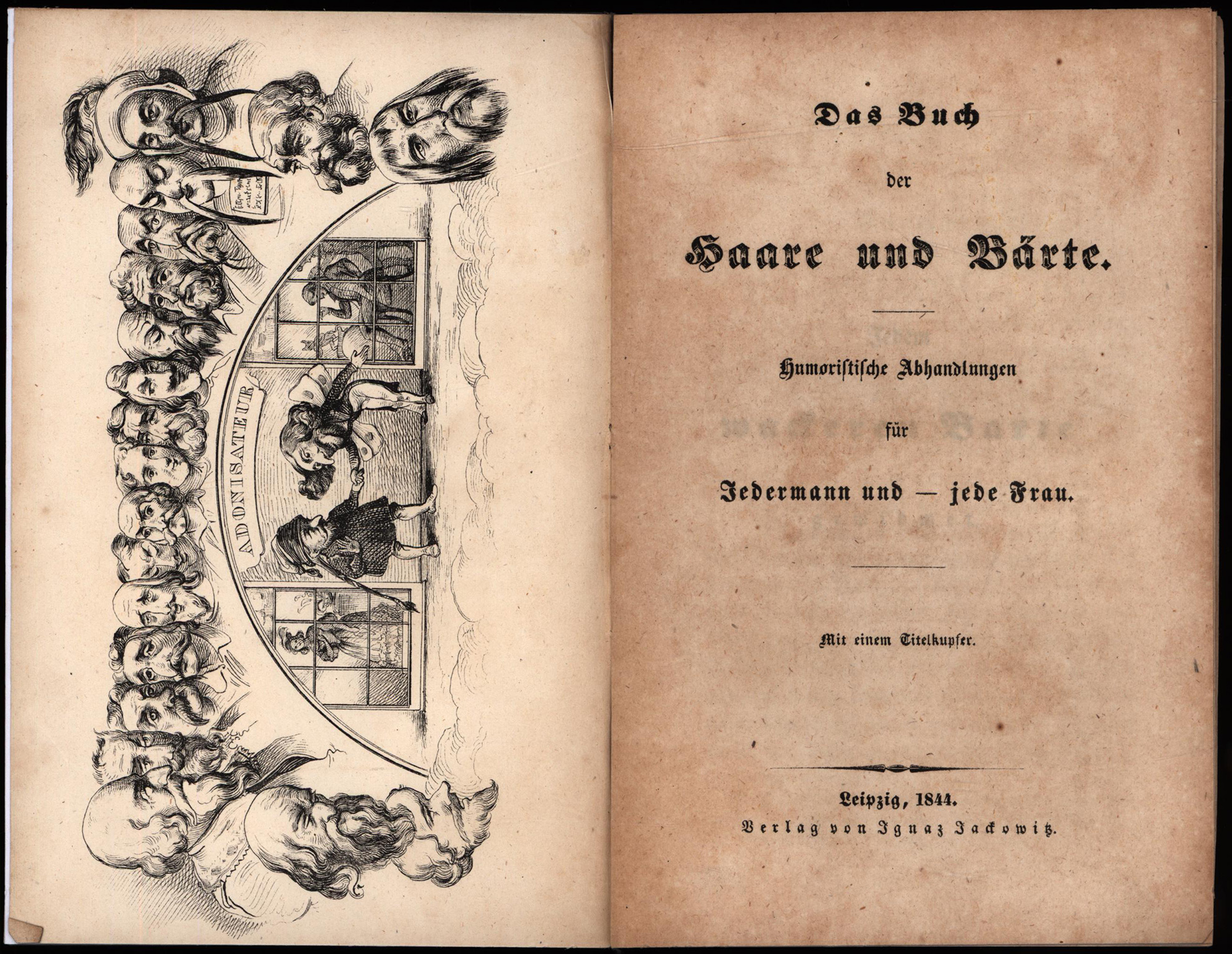 Das Buch der Haare und Bärte. Humoristische Abhandlungen für Jedermann und jede Frau. Mit einem Titelkupfer. Leipzig, Jackowitz Verlag, 1844. Klein-8°. 17 x 11 cm. VIII, 85 Seiten, [1] Blatt. Privater Handeinband aus zwei Pappdeckeln mit Gewebebandrücken und aufkaschierter Original-Broschur auf Deckel.