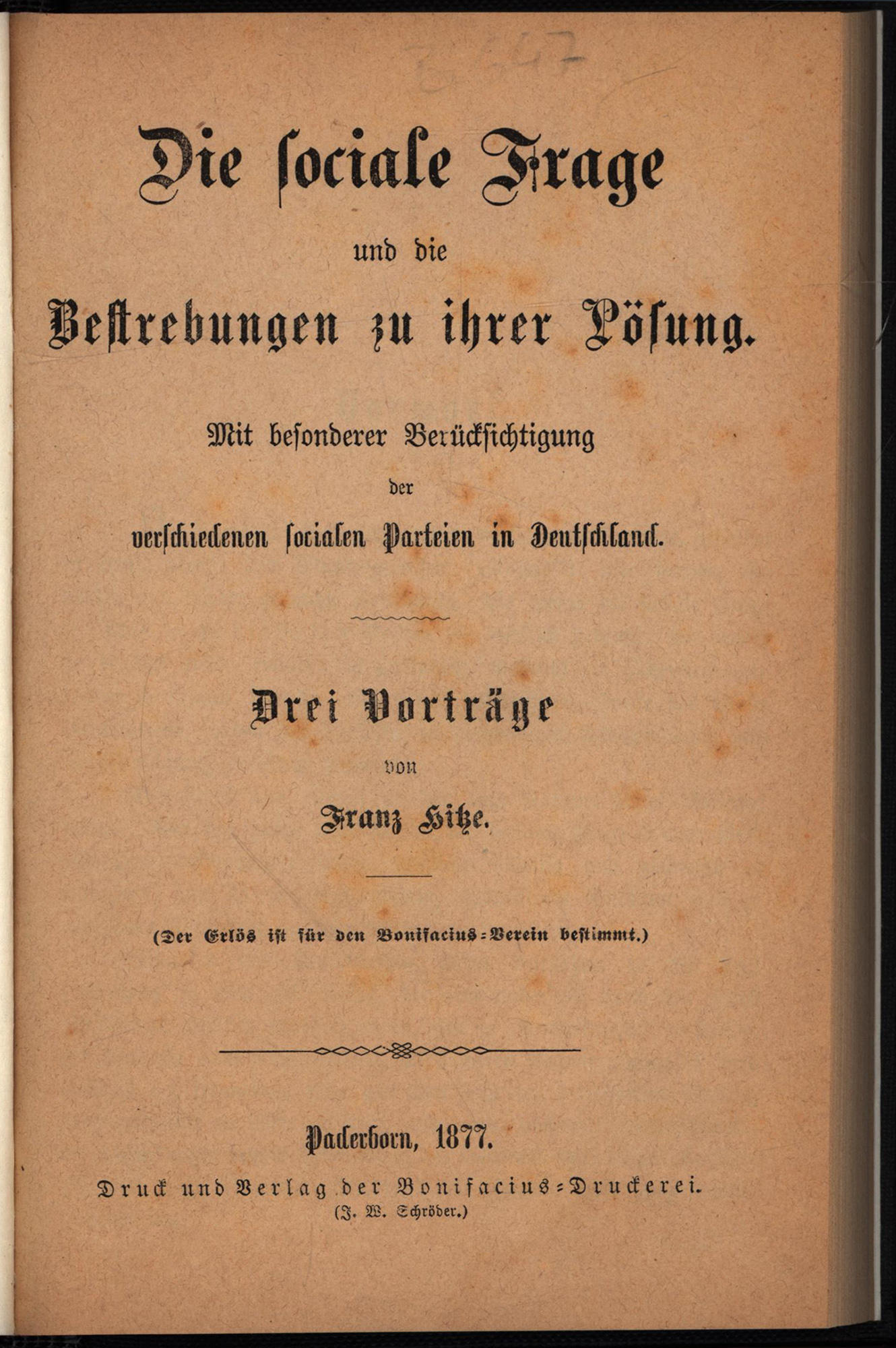 Hitze, Franz: Die sociale Frage und die Bestrebungen zu ihrer Lösung. Mit besonderer Berücksichtigung der verschiedenen socialen Parteien in Deutschland. Drei Vorträge. Paderborn, Bonifacius-Druckerei, 1877. 8°. 19 x 12 cm. 320 Seiten. Bibliotheksleinenband neuerer Zeit mit goldgeprägtem Rückentitel.