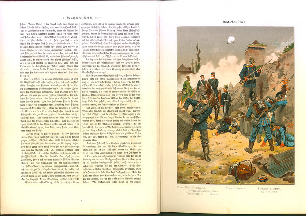 Lohmeyer, Julius [Hrsg.]: Das Militärbilderbuch. Die Armeen Europas. [Erstausgabe.] In Bildern von Richard Knötel, mit Text von Oberstlieutenant Hermann Vogt, herausgegeben Julius Lohmeyer. Mit 36 Bildern in Farbendruck und 14 Vignetten. Glogau, Verlag von Carl Flemming, ca. 1885. 4°. 30 cm. 48 Seiten, 2 Blatt. Illustrierter Original-Halbleinenband.