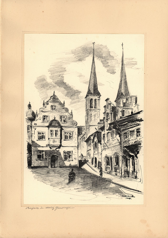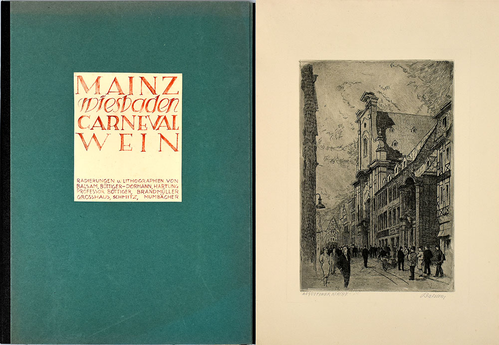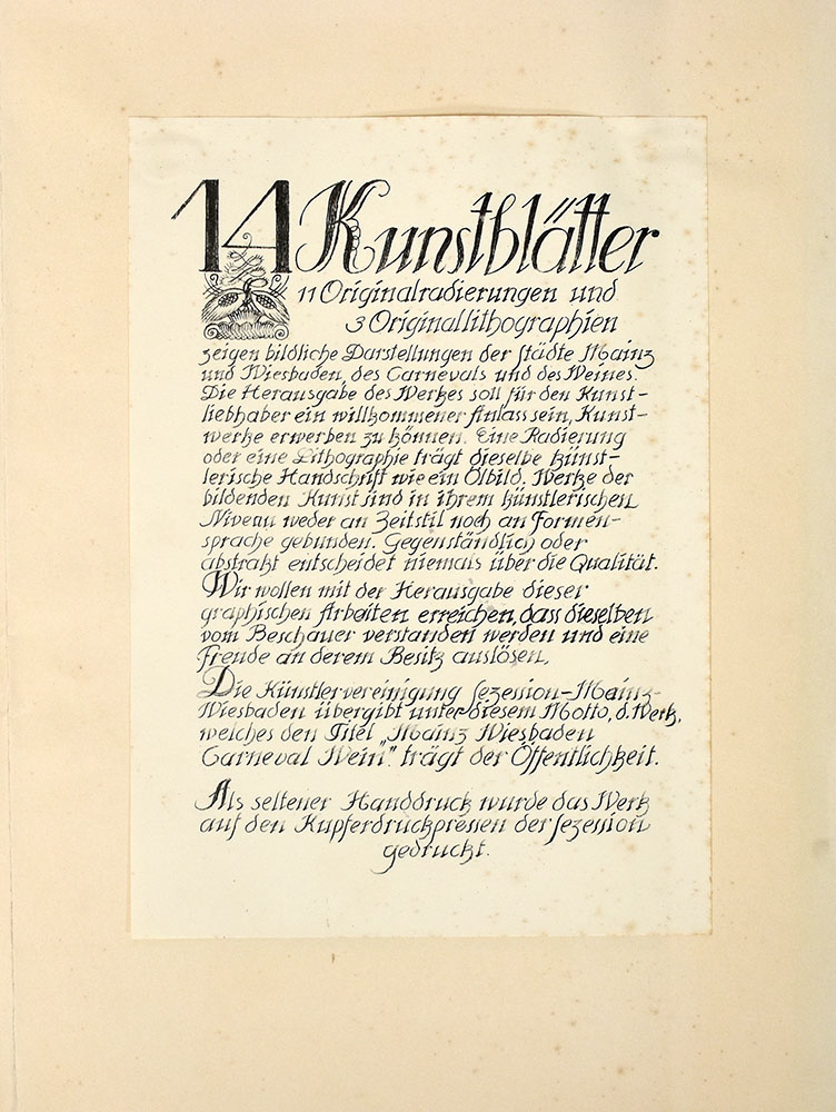 Mainz Wiesbaden Carneval Wein. Radierungen u. Lithographien von Balsam, Böttiger-Dormann, Hartung, Professor Böttiger, Brandmüller, Grosshaus, Schmitz, Mumbächer. [Mit 8 Original-Grafiken.] Künstlervereinigung Sezession-Mainz-Wiesbaden, o. J. 2°. 43 x 32 cm. 10 Kunstblätter in Original-Kartonmappe, ungebunden.