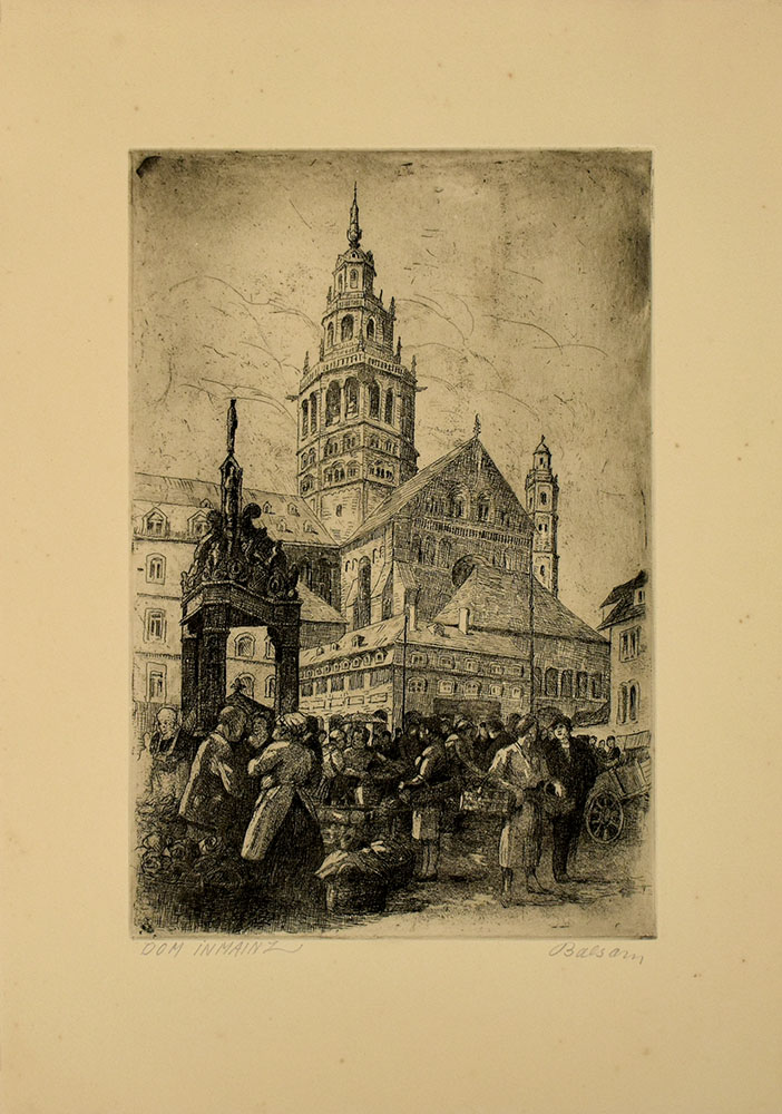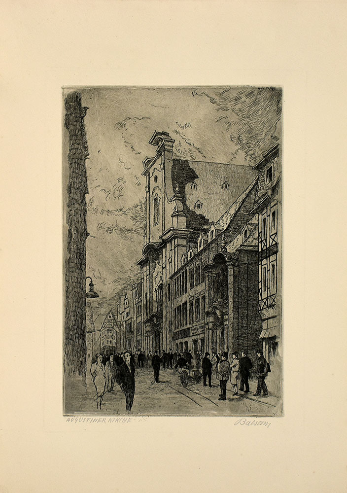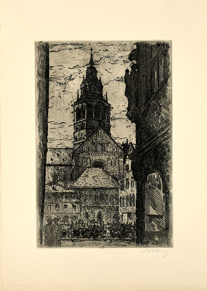 Mit 8 (von insgesamt 12) Original-Radierungen, 2 davon mit „Balsam“ [Rolf C.W. Balsam] signiert, eine mit „Hartung“ signiert, eine mit „W. Großhaus“ signiert, eine von Heinz Mumbächer im Druck signiert, eine unleserlich signiert, sowie mit 3 montierten Lithografien von Brandmüller. Blattränder teils leicht fleckig, wenige Blätter etwas stockfleckig. Gutes Exemplar.