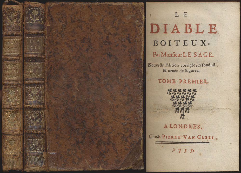 Le Sage, Alain René: Le Diable Boiteux. Nouvelle Edition corrigée, refondue & ornée de Figures. 2 Bände (komplett) / 2 volumes (complete). Londres, chez Pierre van Cleef, 1755. Klein-8°. 16,5 x 10,5 cm. 6 Blatt, 237 (2), 220 (2) Seiten. Ganzlederbände der Zeit mit goldgeprägten Rückentiteln und roten Schnitten im privaten, neueren Pappschuber.