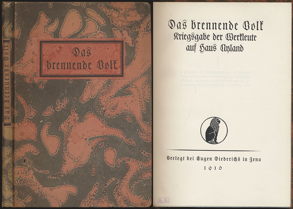 Das brennende Volk. Kriegsgabe der Werkleute auf Haus Nyland. Jena, Eugen Diederichs, 1916. 8°. 22 x 15,5 cm. 119 Seiten. Pappband mit Buntpapierbezug, Rücken- und Deckelschildchen sowie Kopfgoldschnitt.