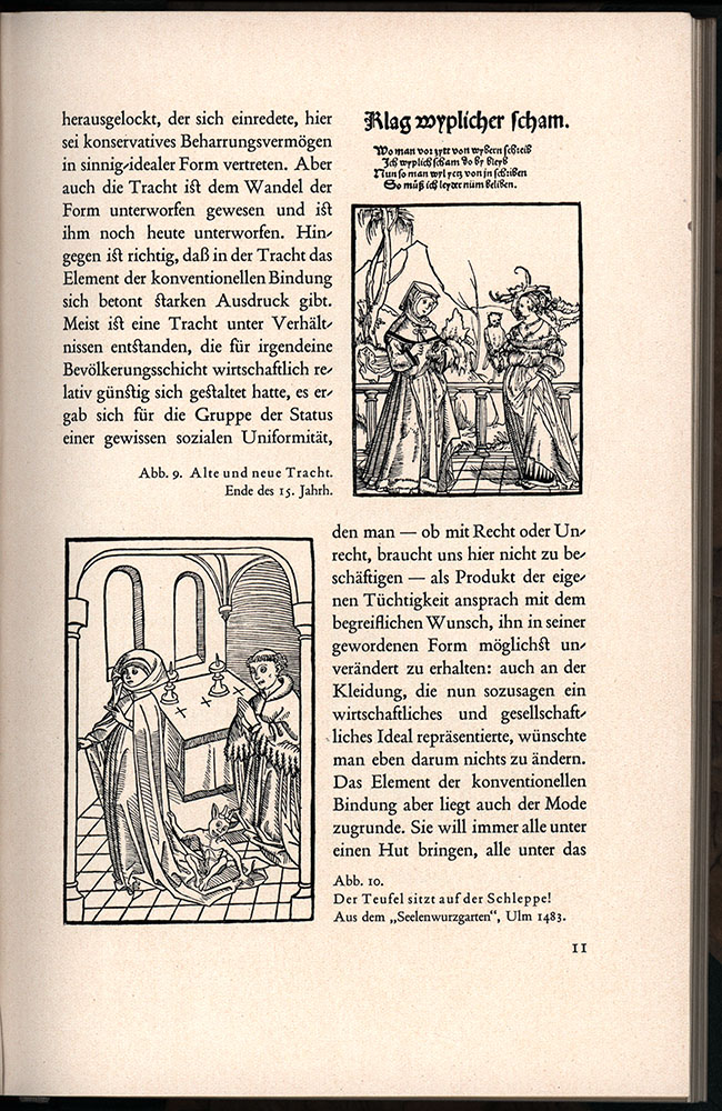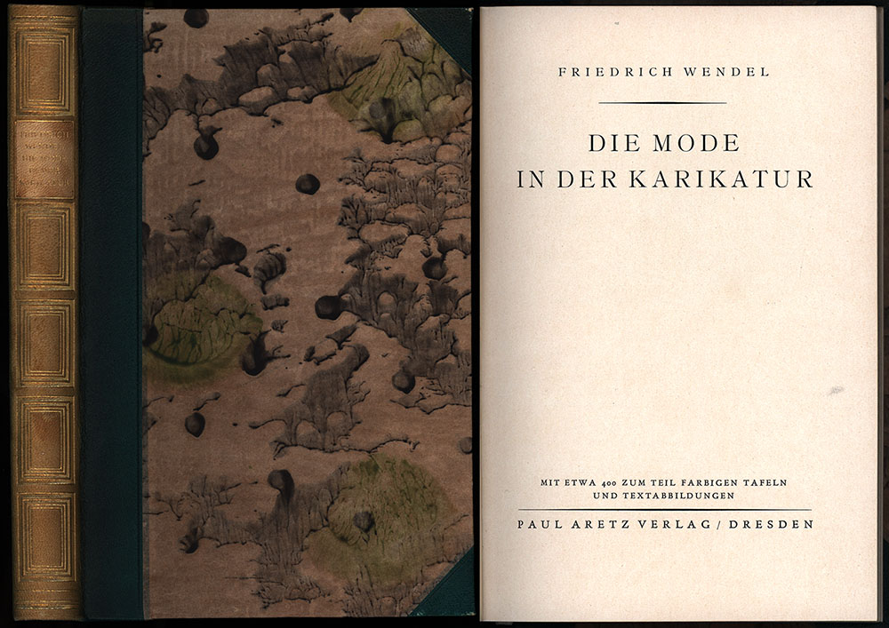 Wendel, Friedrich: Die Mode in der Karikatur. Mit etwa 400 zum Teil farbigen Tafeln und Textabbildungen. [Nummeriertes Exemplar.] Dresden, Paul Aretz Verlag, 1928. 4°. 26 x 18,5 cm. 300 (1) Seiten. Original-Halblederband mit goldgeprägtem Rückentitel, Kleisterpapierbezug und Kopfgoldschnitt.