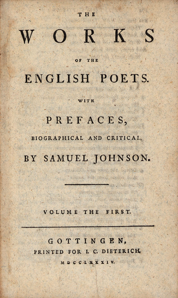 Milton, John – Johnson, Samuel: The Works Of The English Poets. With Prefaces, Biographical and Critical. The Poetical Works of John Milton, Vol. I, containing Paradise Lost. Paradise Regain’d. Plans of Paradise Lost, in the Form of a Tragedy, from Milton’s Manuscript. Gottingen, Printed for I. C. Dieterich, 1784. Klein-8°. 16,5 x 11 cm. 104, (4) 364, 360 Seiten. Ganzlederband auf 4 Bünden mit rotem Schnitt.