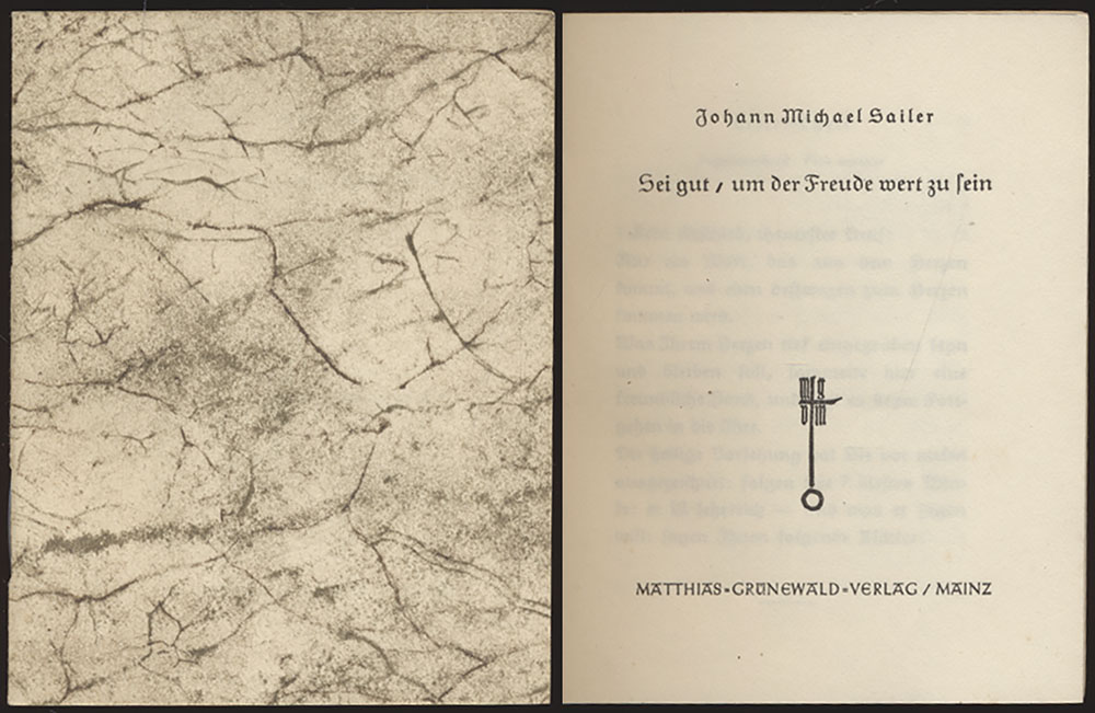 Sailer, Johann Michael: „Sei gut, um der Freude wert zu sein.“ [Faksimile.] Mainz, Matthias Grünewald Verlag, [1940]. 12°. 11 x 8,5 cm. Unpaginiert. 2 Original-Broschuren im Original-Pappschuber.