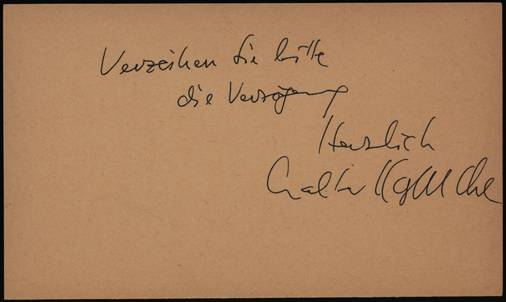 Von Walter Kappacher rückseitig signierte Porträtfotografie, Maße: 14,8 x 10,1 cm, mit einer beliegenden signierten Karte „Verzeihen Sie bitte die Verzögerung“, Maße: 8,7 x 14,9 cm. Sehr gutes Exemplar.