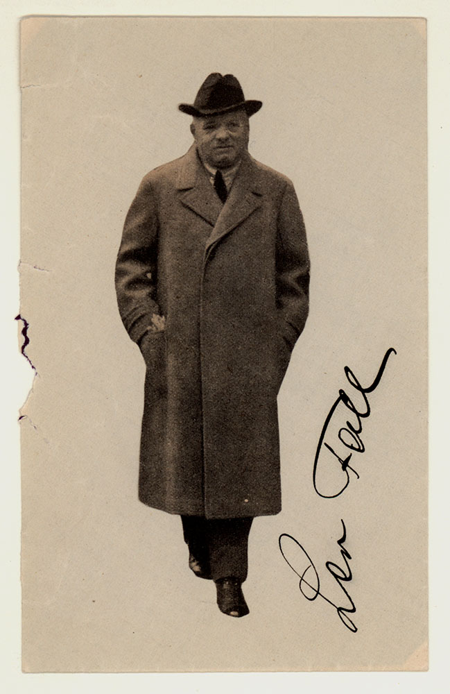 In einer Passepartoutkarte montierter Briefumschlag, darauf (nebst einer montierten Ganzkörper-Abbildung in Schwarz-Weiß) von Leo Fall in schwarzer Tinte signiert. Blattgröße: 24 x 18 cm, Maße des Briefumschlags: 15 x 9,5 cm. Karte innenliegend mit handschriftlichen biografischen Angaben zu Leo Fall in Blei. Insgesamt noch sehr gutes Exemplar.