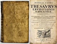 Barth, Caspar von: Adversariorum Commentariorum Libri LX. Quibus ex universa antiquitatis serie, omnis generis, ad vicies octies centum, auctorum, plus centum quinquaginta millibus, loci… Eduntur praeterea ex vetustatis monumentis praeclara hoc opere non pauca, nec visa hactenus, nec videri sperata. Cum undecim indicibus; VII Auctorum, IV Rerum & Verborum. [Abweichener Vortitel: Casparis Barthi adversariorum commentariorum libri sexaginta. Antiquitatis, tam gentilis quam Christi anae, illustratae, Tomus I. ]. 60 Teile in 1 Band. Francofurtensis [Frankfurt], sumptibus Iohannes Pressii Bibliopolae [Johann Press], 1648. 2°. 37 x 23 cm. [34] Blatt, 3031 [recte 2931] Spalten, [26] Blatt. Pergamentband der Zeit mit Rückentitel in Tinte von alter Hand und Rotschnitt.