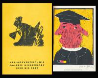 Albrecht, Eduard: Das Testament des Ferkels. [Signiert, mit zusätzlichem Original-Holzschnitt]. Ohne Ort, ohne Verlagsangabe, ohne Jahr. Quer-8°. 21 x 22,5 cm. 17 Blatt. Original-Broschur, als Blockbuch gebunden, im Original-Pappschuber.
