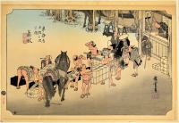 Utagawa Hiroshige: Station Fujieda. [Original-Farbholzschnitt]. (Utagawa Hiroshige, (auch unter Ando Hiroshige bekannt), geb. 1797 in Edo (heute: Tokio), gest. 12.10.1858. Mit Kuniyoshi und Kunisada einer der drei stilbildenden Meister des japanischen Farbholzschnitts am Ende der Edo-Zeit. Seine besondere Bedeutung liegt in einer völlig neuartigen Komposition des Landschaftsdruckes seiner Zeit und seinem maßgeblichen Einfluss auf die Entwicklung des europäischen Impressionismus).