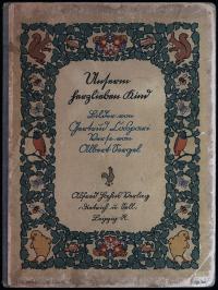 Caspari, Gertrud: König ist unser Kind! Mit Versen von Adolf Holst. Leipzig, Alfred Hahns Verlag Dietrich und Sell, [ca. 1922]. Quer Groß-8°. 24,5 x 18,5 cm. 16 Seiten. Original-Pappband als Leporello gebunden mit farbiger Deckelillustration. (= [Verlags-]Nr. 7).