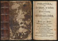 Arndt, Johann: Des hocherleuchteten Lehrers Herrn Johann Arndts, weiland General-Superintendenten des Fürstenthums Lüneburg, Sechs Bücher vom wahren Christenthum. Welche handeln von heilsamer Buße, herzlicher Reue und Leid über die Sünde, und wahrem Glauben, auch heiligem Leben und Wandel der rechten wahren Schriften. Mit beygefügtem Lebenslauf des sel. Herrn Autors, ingleichen kurzen Gebeten nach jedem Capitel, Morgen- und Abendsegen auf alle Tage in der Woche, und nöthigen Registern, auch schönen Sinnbildern, nebst dessen Paradiesgärtlein. Nach der accuratesten Edition aufs neue collationirt und unverändert herausgegeben. Und: Des geist- und trostreichen seligen Johann Arndts, weiland Genral-Superintendenten des Fürstenthums Lüneburg, Paradiesgärtlein, voller Christlichen Tugenden, wie solche zur Uebung des wahren Christenthums durch geistreiche Gebete in die Seelen zu pflanzen; dem beigefüget vierzehn Wundergeschichten welche sich mit diesem Buch begeben; ingleichen Morgen- und Abendsegen auf alle Tage in der Woche, wie auch ein dreyfaches Register, so den Nutzen und Gebrauch dieses Buches weiset. [2 Bände in 1.] Philadelphia, Mentz und Rovoudt, [1832]/1834. 4°. 23,5 x 15,5 cm. 2 Blatt, 941 (1) Seiten, 1 Blatt, 232 Seiten. Original-Ganzlederband.